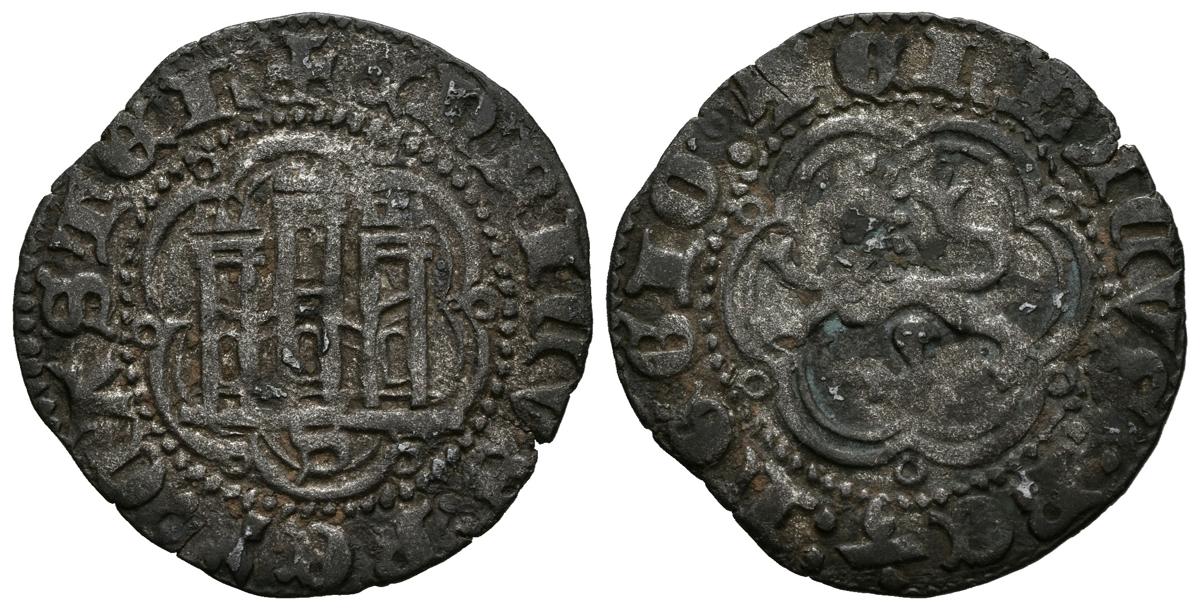 HENRY III (1390-1406). White. (See 1.64g / 23mm). Sevilla. (FAB-602 var). Anv: Castle, under mint mark, all within lobular beading, around legend: + ENRICVS REX GRACIA. Rev: Lion rampant to the left within the lobar graph, around the legend: + ENRICVS DEI LEGIO. Very Fine.
