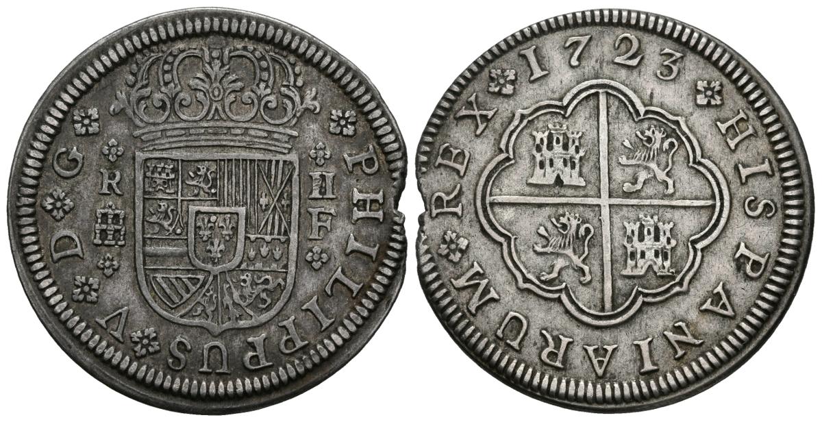 FELIPE V (1700-1746). 2 Reales. (Ar. 5.75g / 27mm). 1723. Segovia F. (Cal-2019-958). Good Very Fine. Notch on the edge.