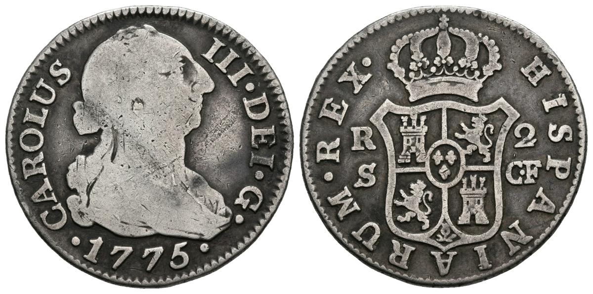 English CARLOS III (1759-1788). 2 Reales (Ar. 5.57g / 26mm). 1775. Sevilla CF. (Cal-2019-783). Fine/ Almost Very Fine.