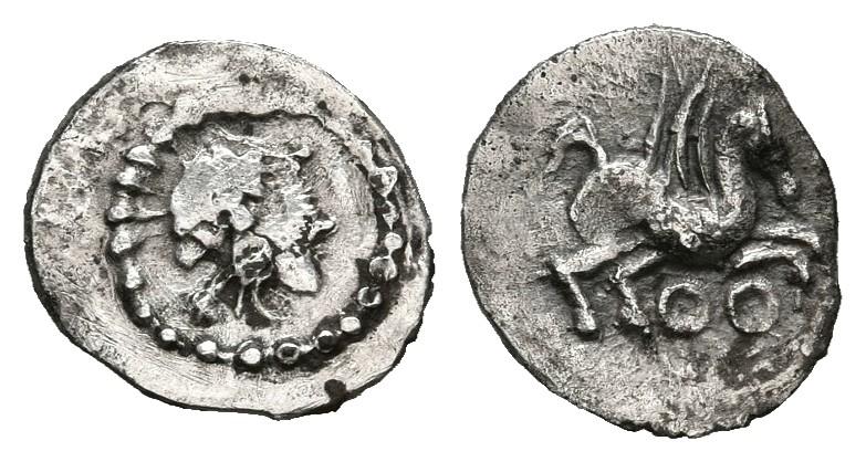 English CARTAGONOVA (Cartagena, Murcia). 1/36 Shekel. (Ar. 0.16 / 7mm). 200-190 BC (FAB-566). Anv: Male head to the right. Rev: Pegasus on the right with two roels underneath. Very Fine. Cleaned.
