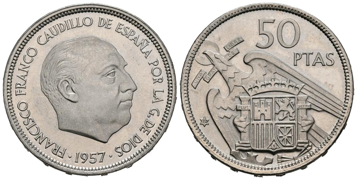 English SPANISH STATE (1936-1975). 50 Pesetas. (Ni. 12.52g / 30mm). 1957 * 72. Madrid. (Cal-2019-141). Uncirculated. Original Luster .
