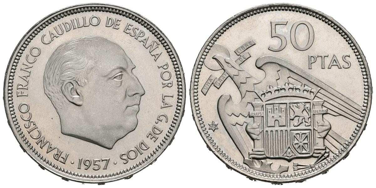 SPANISH STATE (1936-1975). 50 Pesetas. (Ni. 12.31g / 30mm). 1957 * 73. Madrid. (Cal-2019-142). Uncirculated. Original Luster .