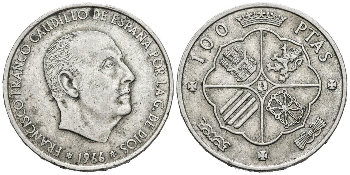 SPANISH STATE (1936-1975). 100 Pesetas (Ar. 19,14g / 34mm). 1966 * 67. Song variant with FREE together with PTAS. (Cal-2019-146 var). Very Fine.