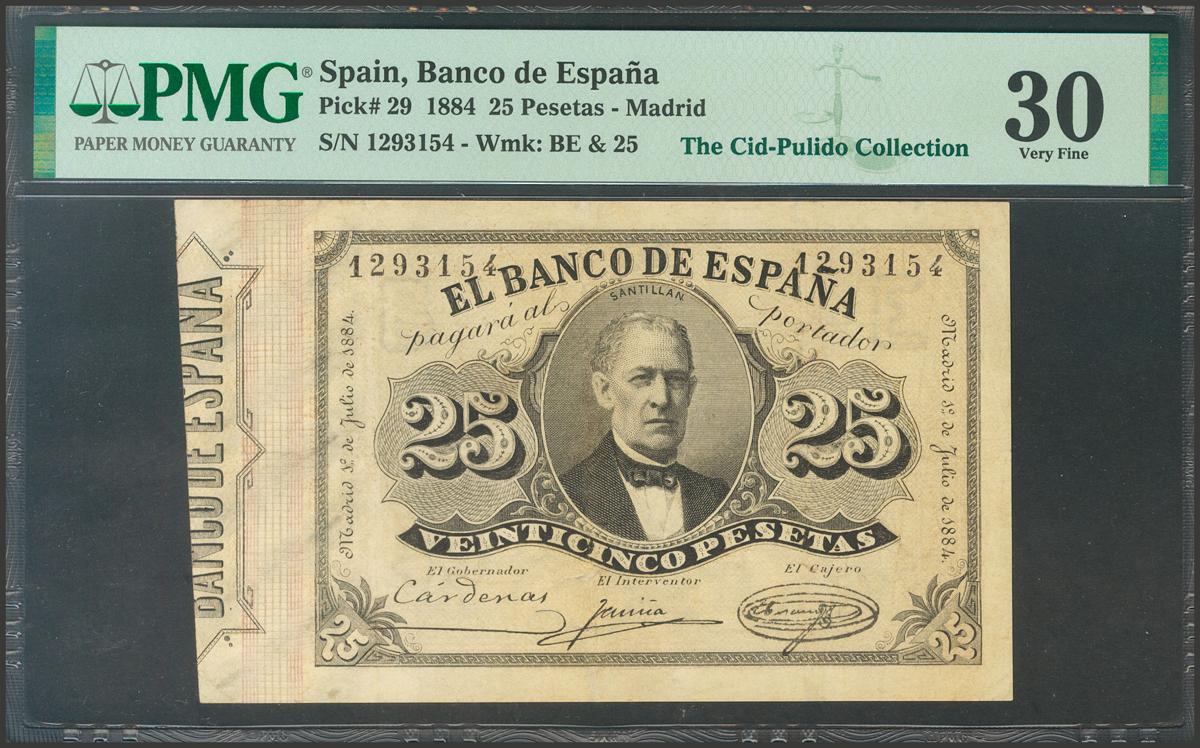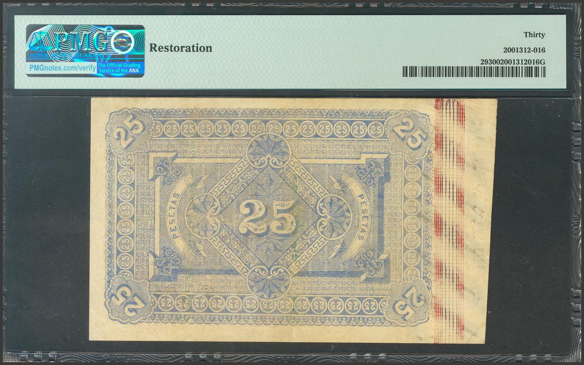25 Pesetas. July 1, 1884. Without series. (Edifil 2017: 287). Rare, small repair. Very Fine. Packaged PMG30.