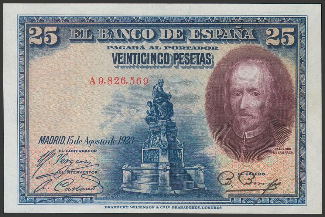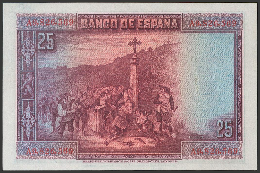 25 Pesetas. August 15, 1928. Series A. (Edifil 2017: 353). It keeps all its original size. Almost Uncirculated.
