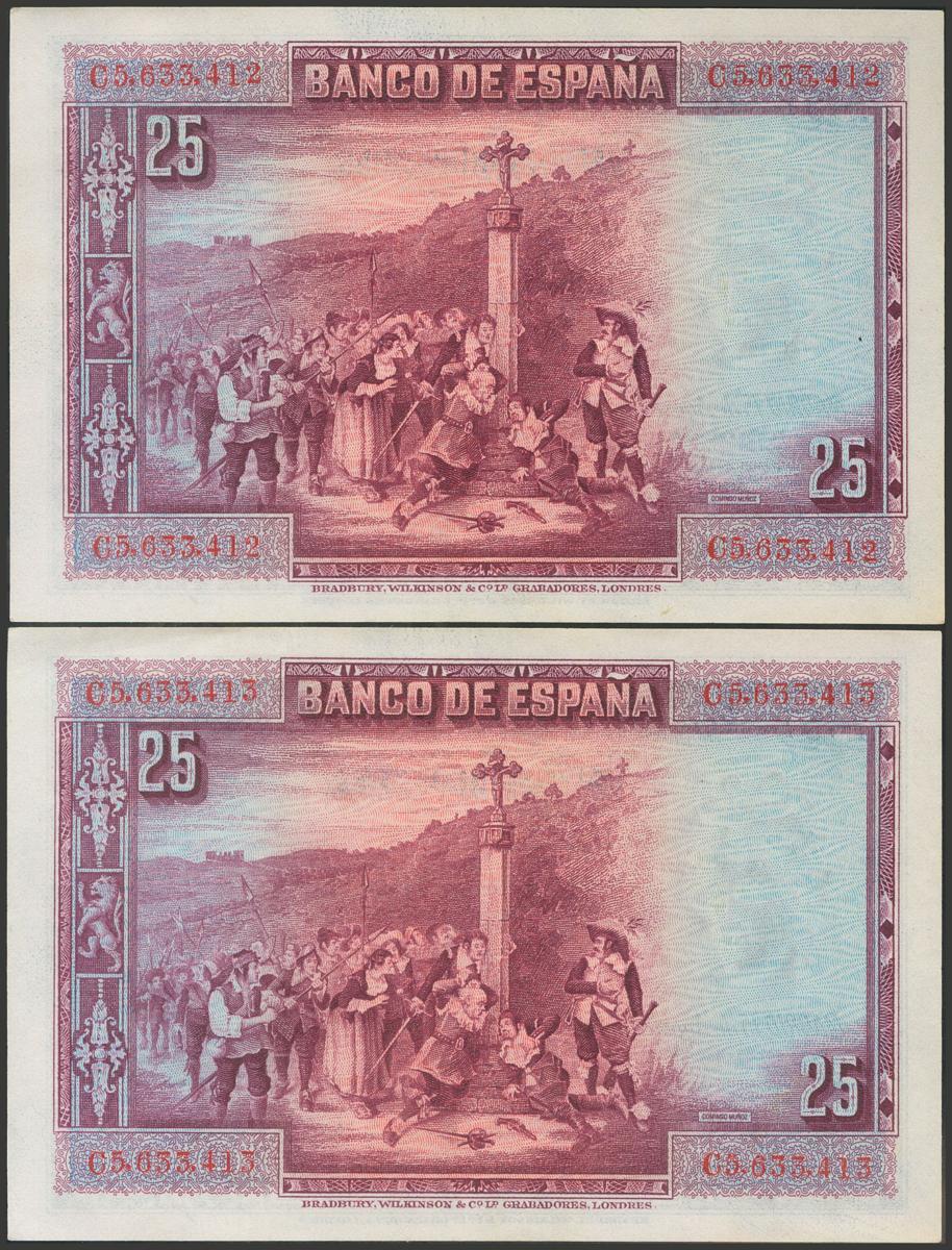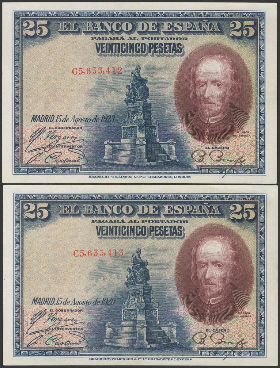 25 Pesetas. August 15, 1928. Correlative couple. Series C. (Edifil 2017: 353). Retains all its original size, slight waviness without breaking fiber. Good Extremely Fine.
