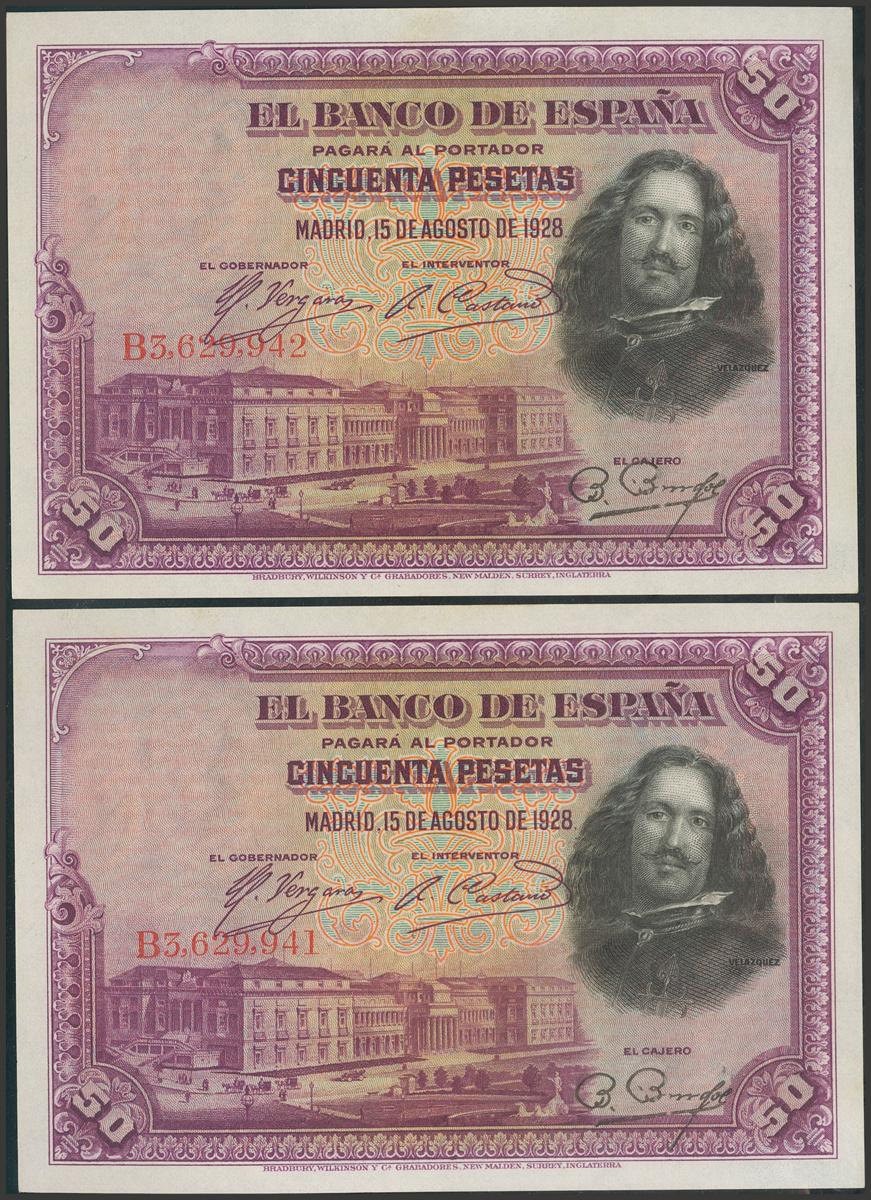 50 Pesetas. August 15, 1928. Correlative couple. Series B. (Edifil 2017: 354). It keeps all its original size. Almost Uncirculated.