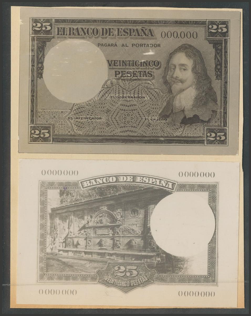 English Set of 3 photographic proofs of a non-issued 25 Pesetas banknote, presenting the bust of Charles I of England (includes proof of the front and back with the number 000000 and another proof of the back with another reason). Beautiful and very rare set of an unpublished banknote to date.