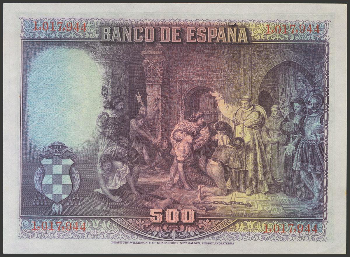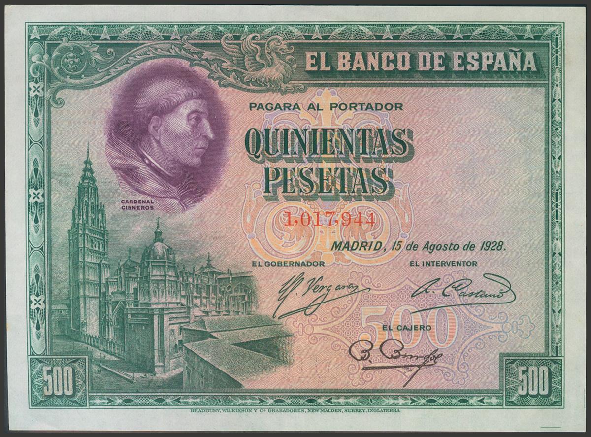 500 pesetas. August 15, 1928. Without series. (Edifil 2017: 356). Original sizing and unimportant dot on the left margin. Good Extremely Fine.