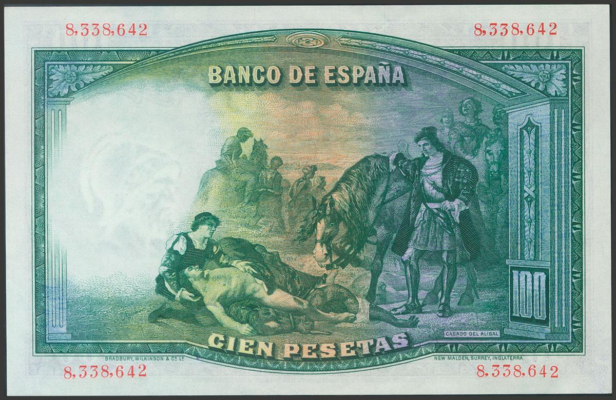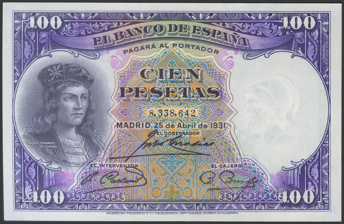 100 pesetas. April 25, 1931. Without series. (Edifil 2017: 360). It keeps all its original size. Almost Uncirculated.