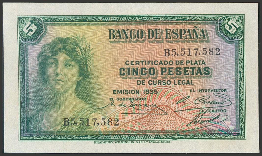 5 Pesetas. 1935. Silver Certificate. Series B. (Edifil 2017: 363a). Extremely Fine.