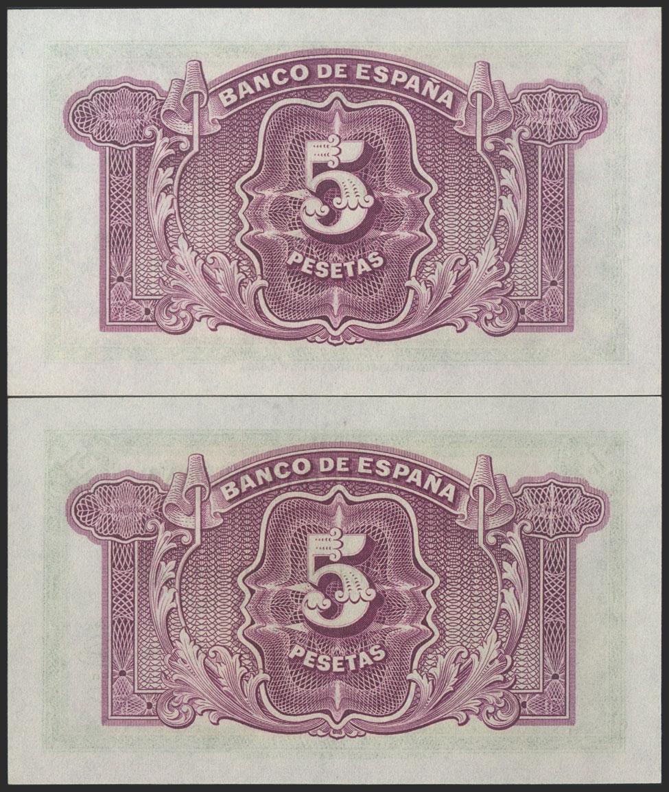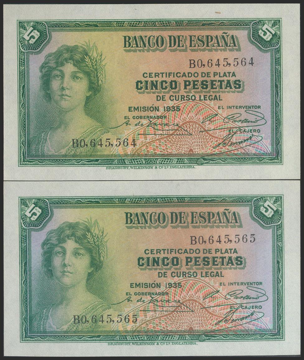 5 Pesetas. 1935. Silver Certificate. Correlative pair. Series B. (Edifil 2017: 363a). Original sizing. Uncirculated.