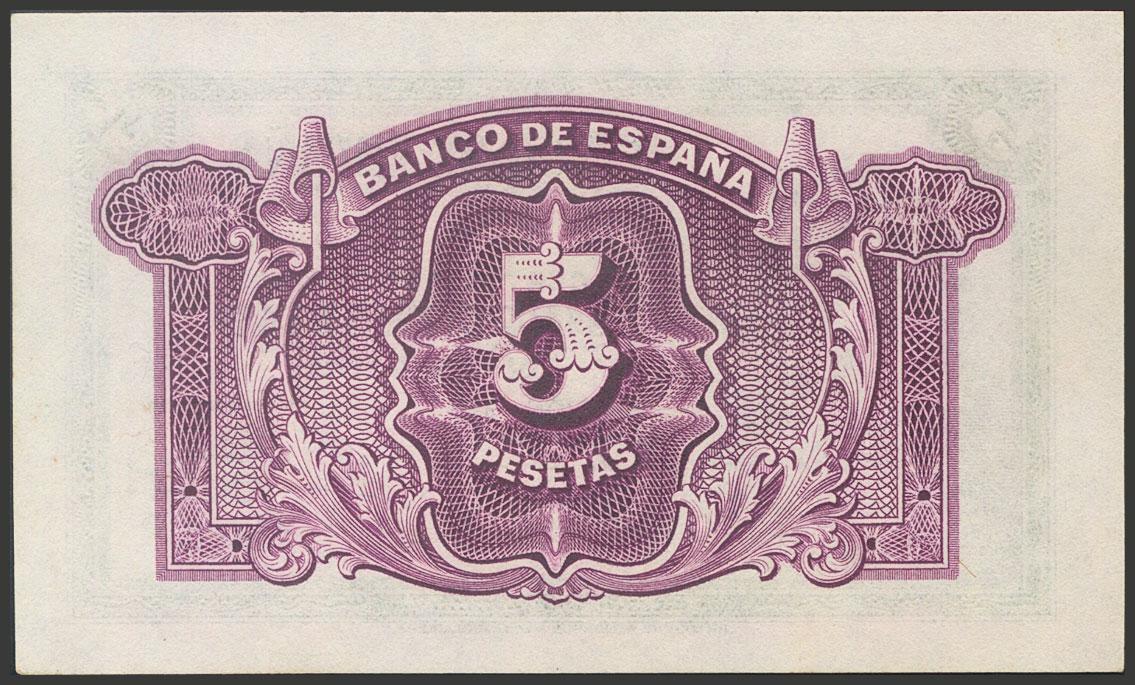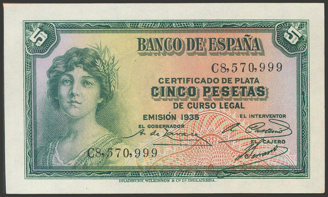 English 5 Pesetas. 1935. Silver Certificate. Series C. (Edifil 2017: 363a). Uncirculated.