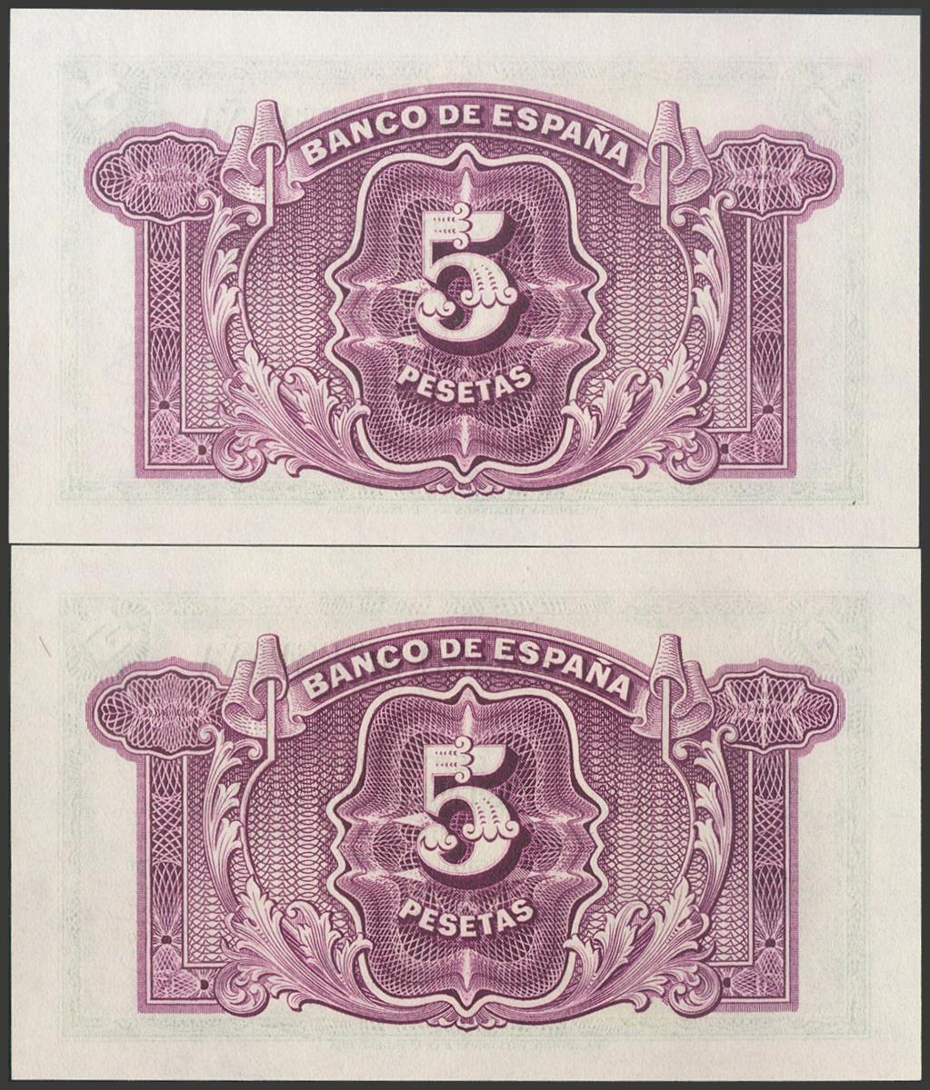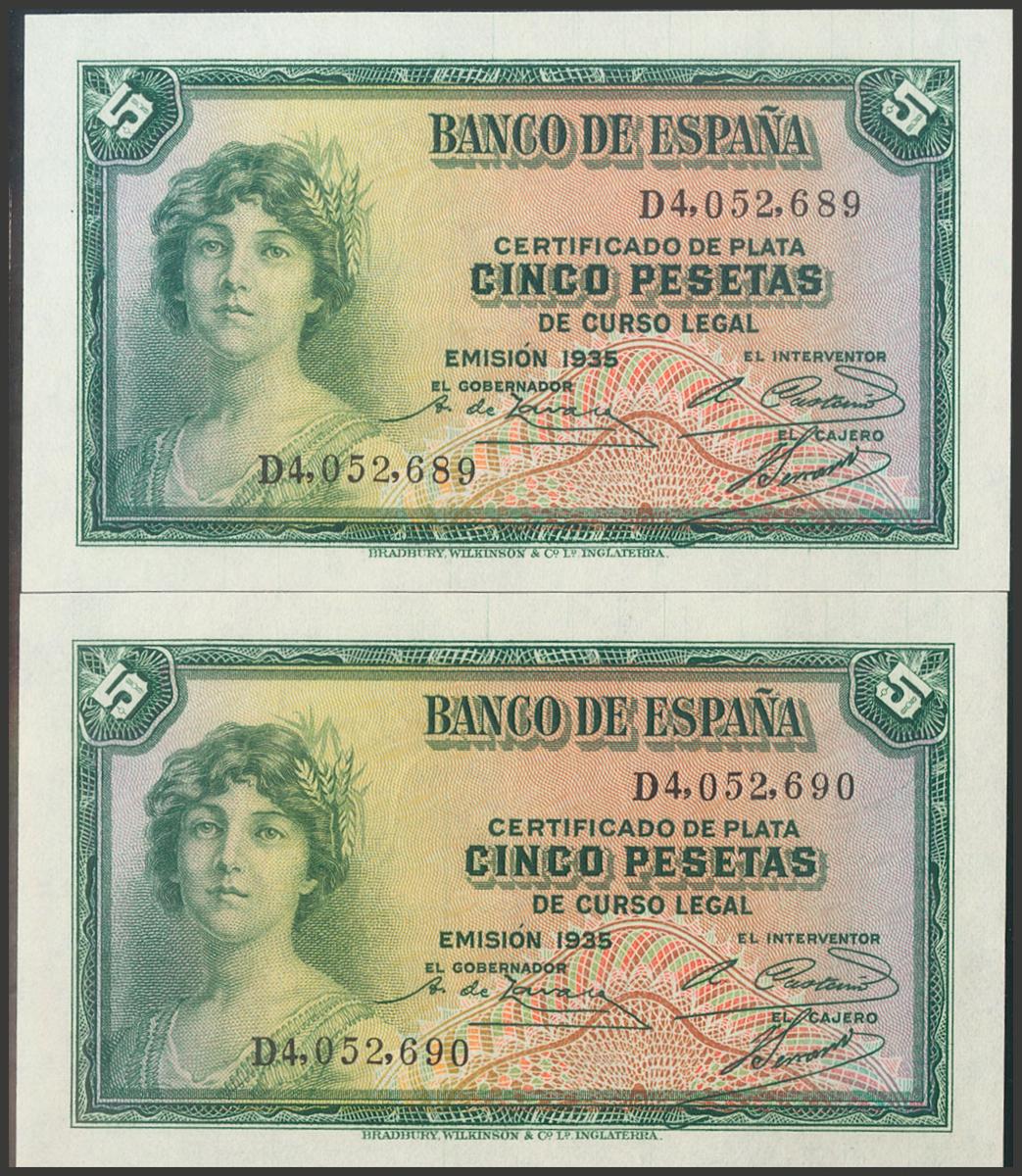 5 Pesetas. 1935. Silver Certificate. Correlative pair. Series D. (Edifil 2017: 363a). Original sizing. Uncirculated.
