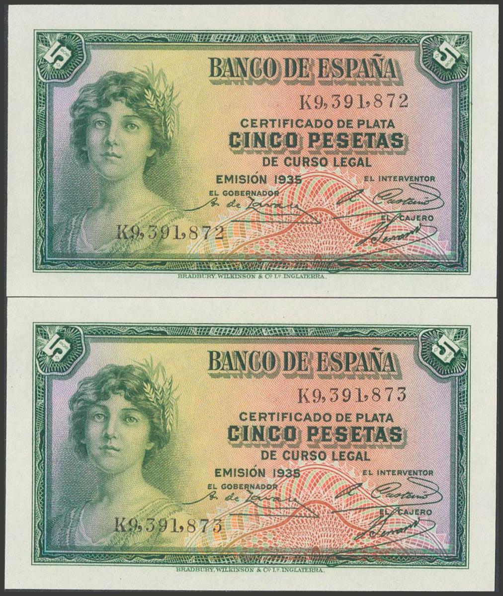 5 Pesetas. 1935. Correlative couple. Series K. (Edifil 2017: 363b). Original sizing. Uncirculated.
