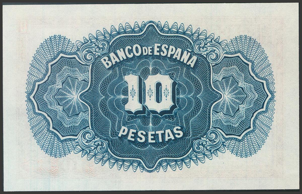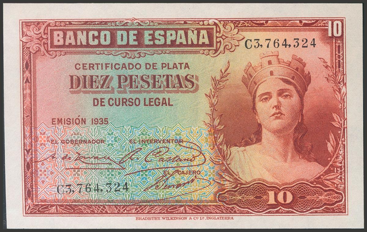English 10 Pesetas. 1935. Silver Certificate. Series C, last series. (Edifil 2017: 364a). Original sizing. Uncirculated.