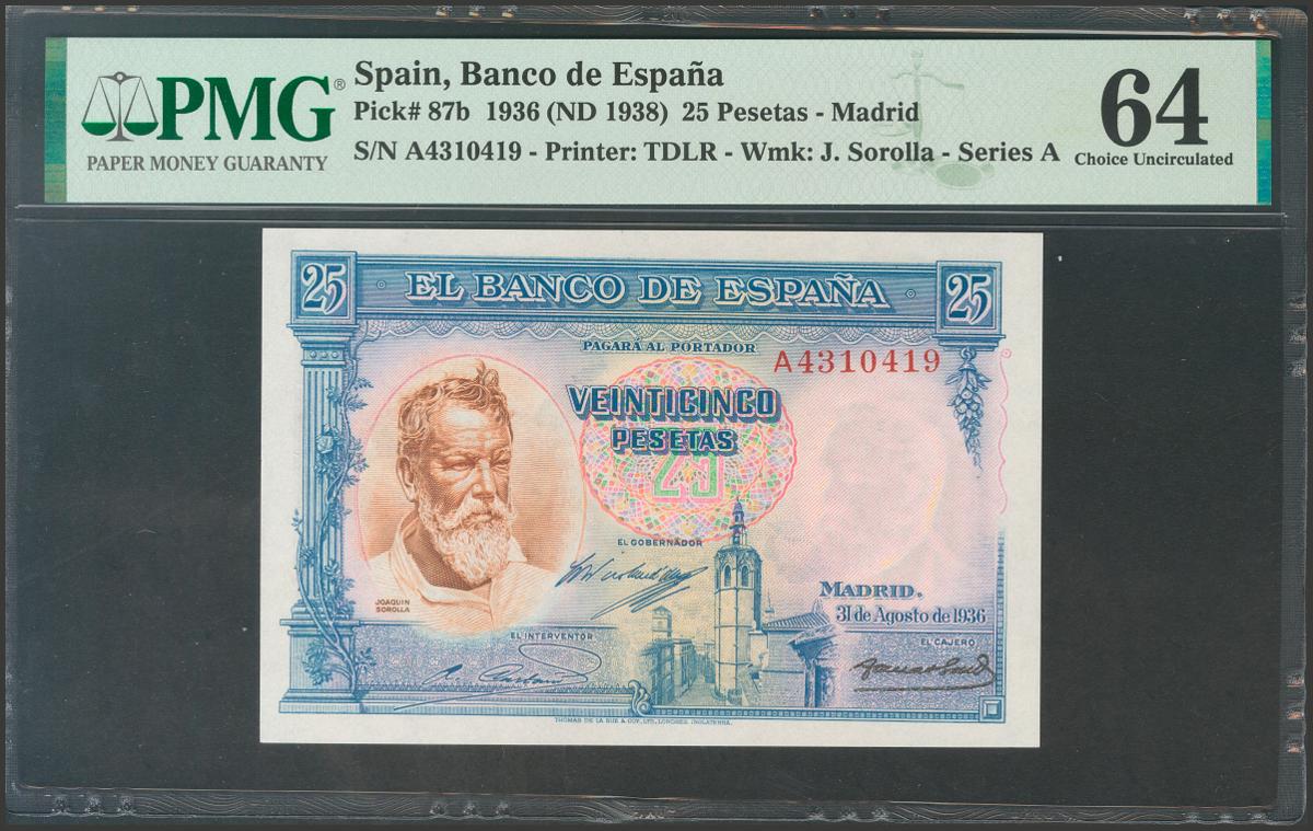 25 Pesetas. August 31, 1936. Series A. (Edifil 2017: 367a). Uncirculated. PMG64 package.