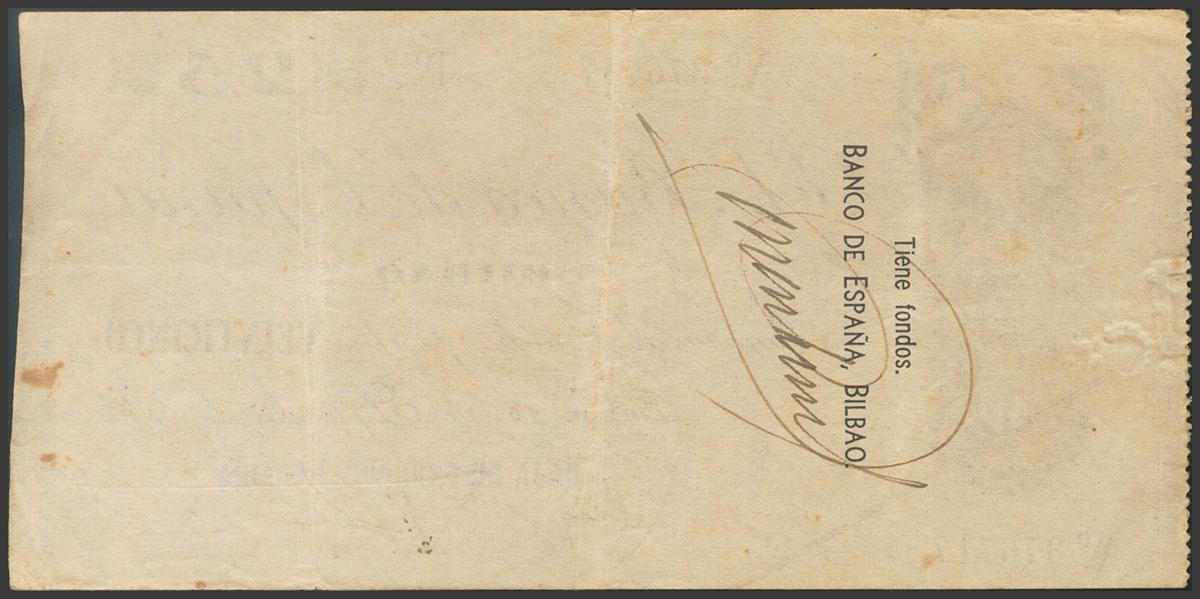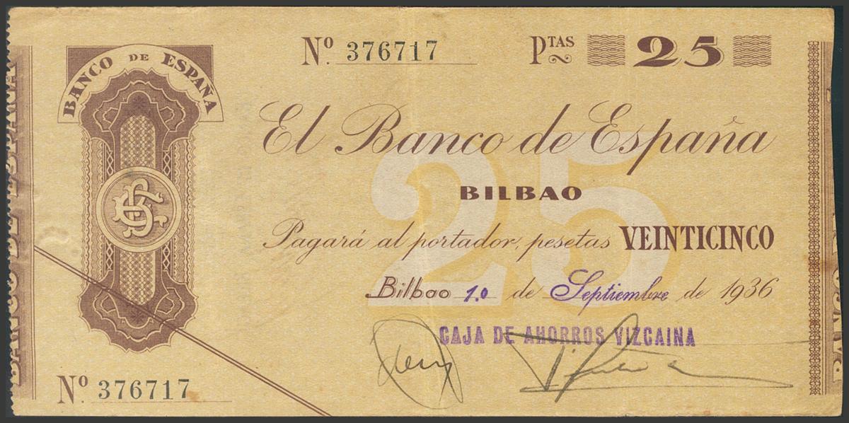 25 Pesetas. September 1, 1936. Bilbao branch. Without series and signature of the Vizcaína Savings Bank. (Edifil 2017: 369i). Extremely Fine.