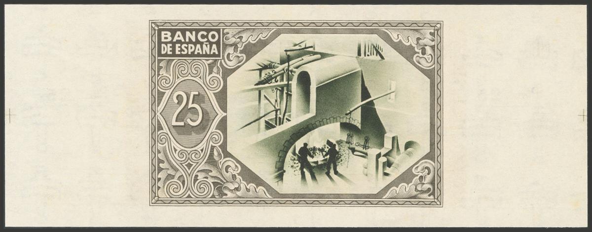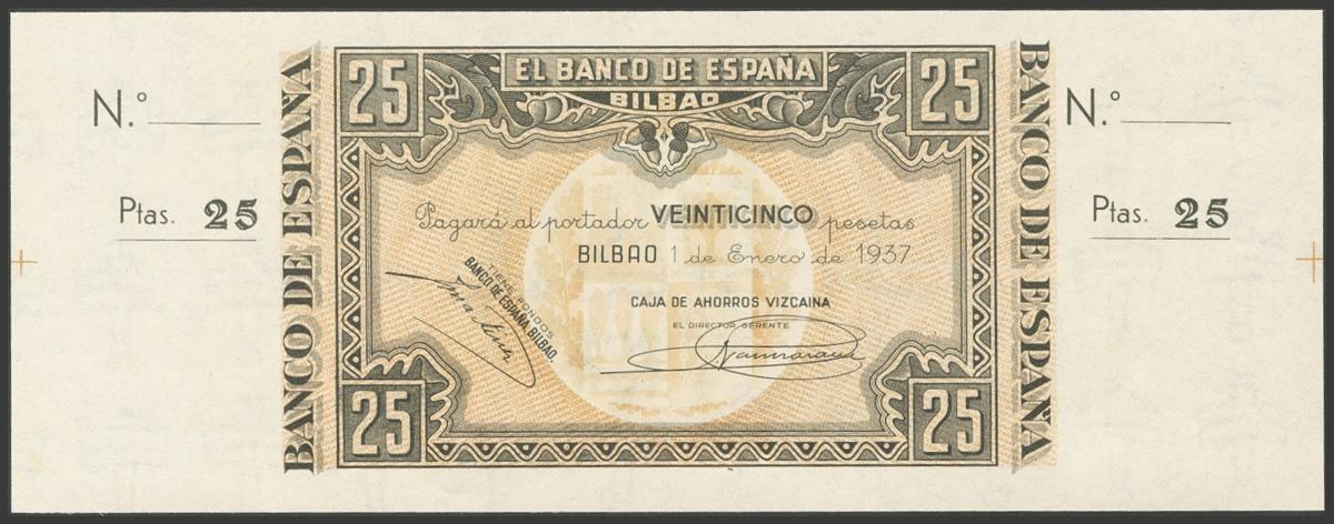 25 Pesetas. January 1, 1937. Bilbao branch, previously signed by Caja de Ahorros Vizcaína. Without series and without numbering, with both matrices. (Edifil 2017: 388a). Uncirculated.