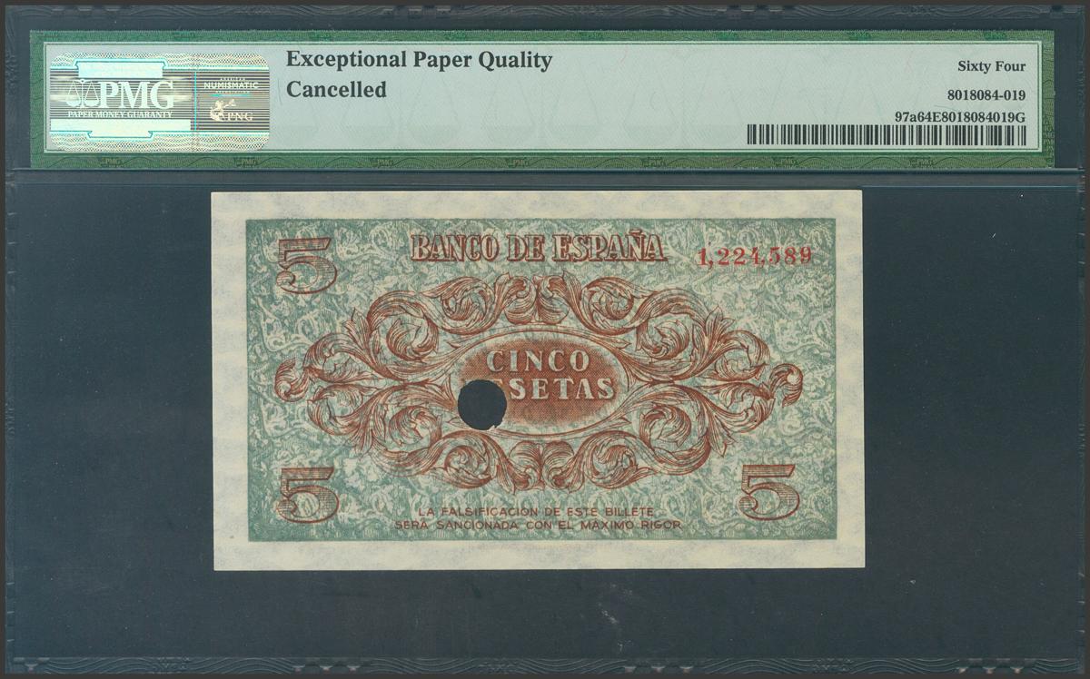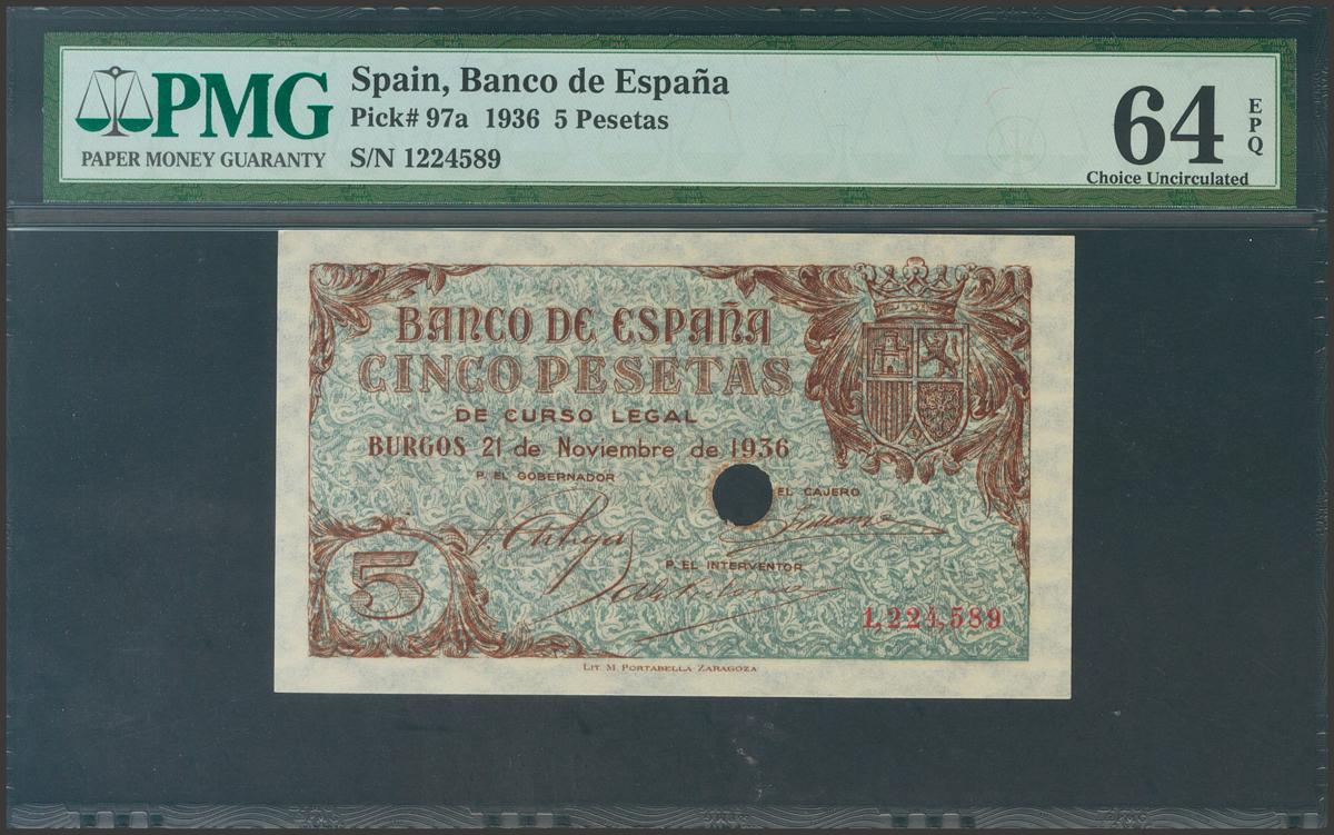 English 5 Pesetas. November 21, 1936. Without series and central hole. (Edifil 2021: 417T). Rare, original sizing. Uncirculated. PMG64EPQ package.