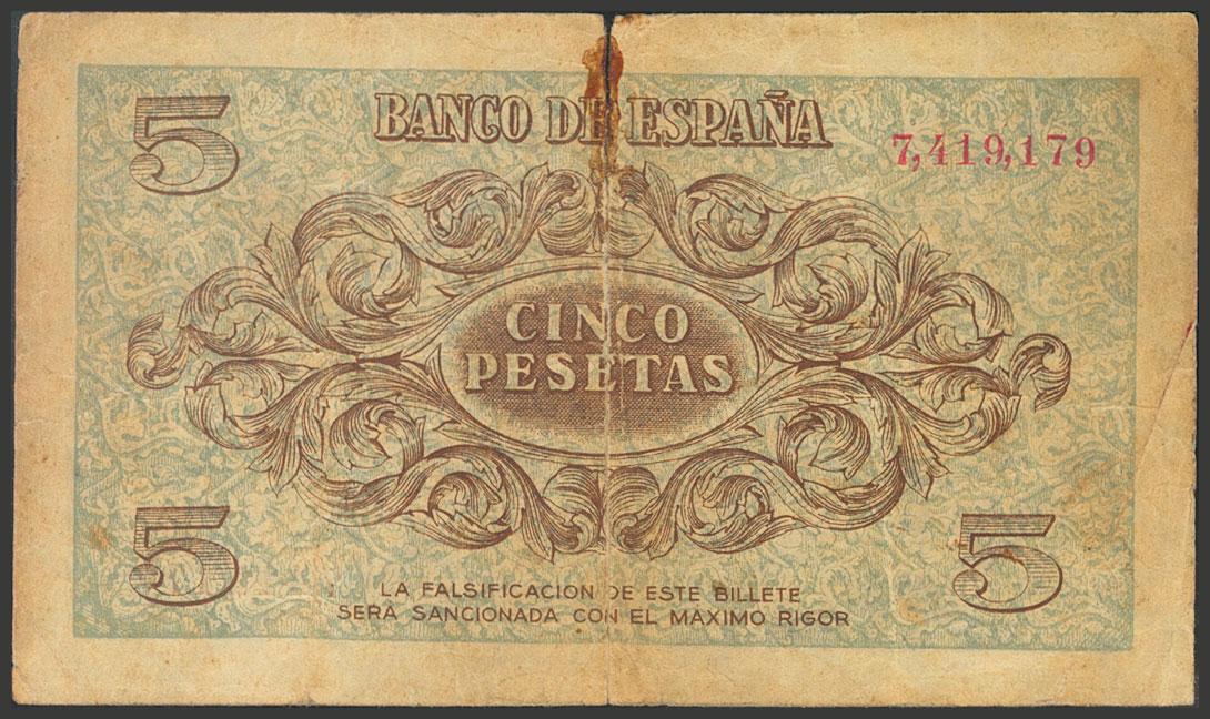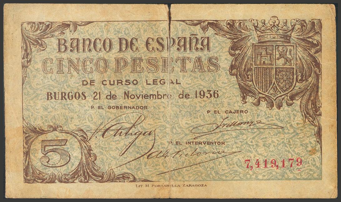 5 Pesetas. November 21, 1936. Without series. (Edifil 2017: 417). Good.