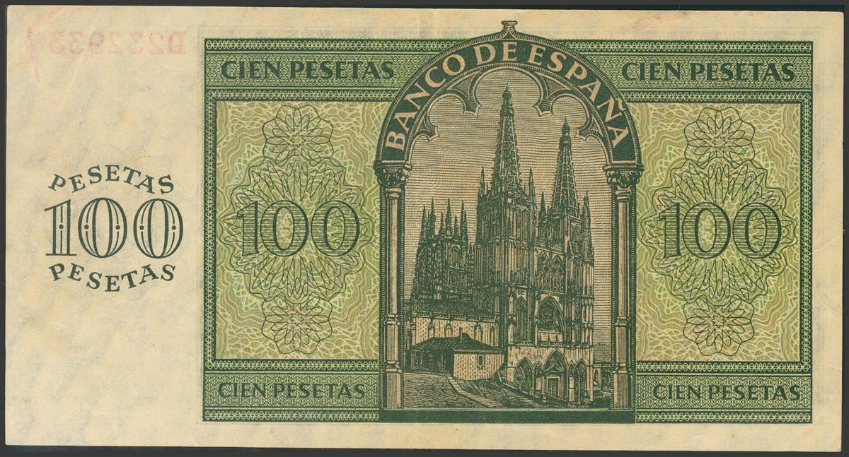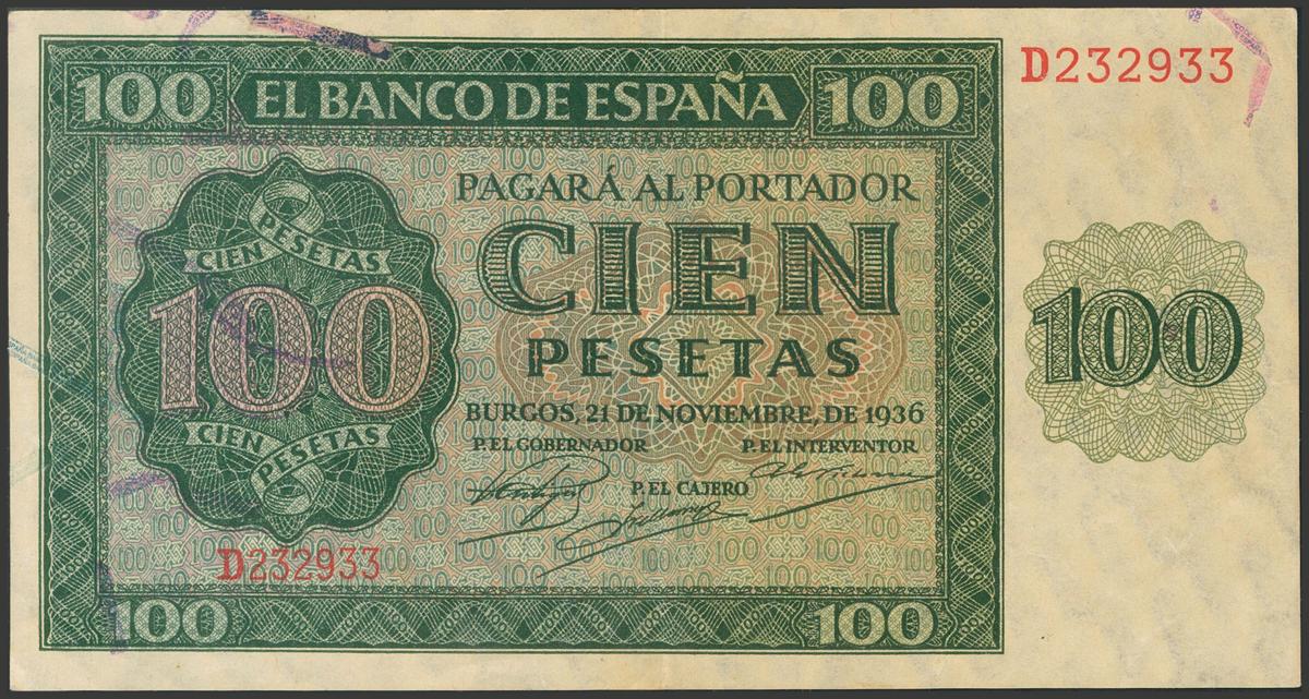 100 pesetas. November 21, 1936. Series D. (Edifil 2017: 421a). Retains part of the original size. Extremely Fine.