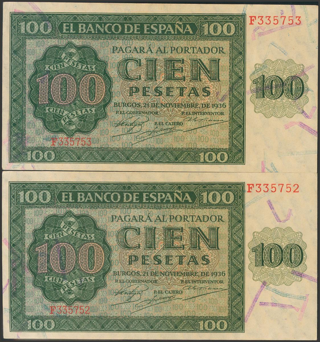 100 pesetas. November 21, 1936. Correlative pair. Series F. (Edifil 2017: 421a). It keeps all its original size. Almost Uncirculated.
