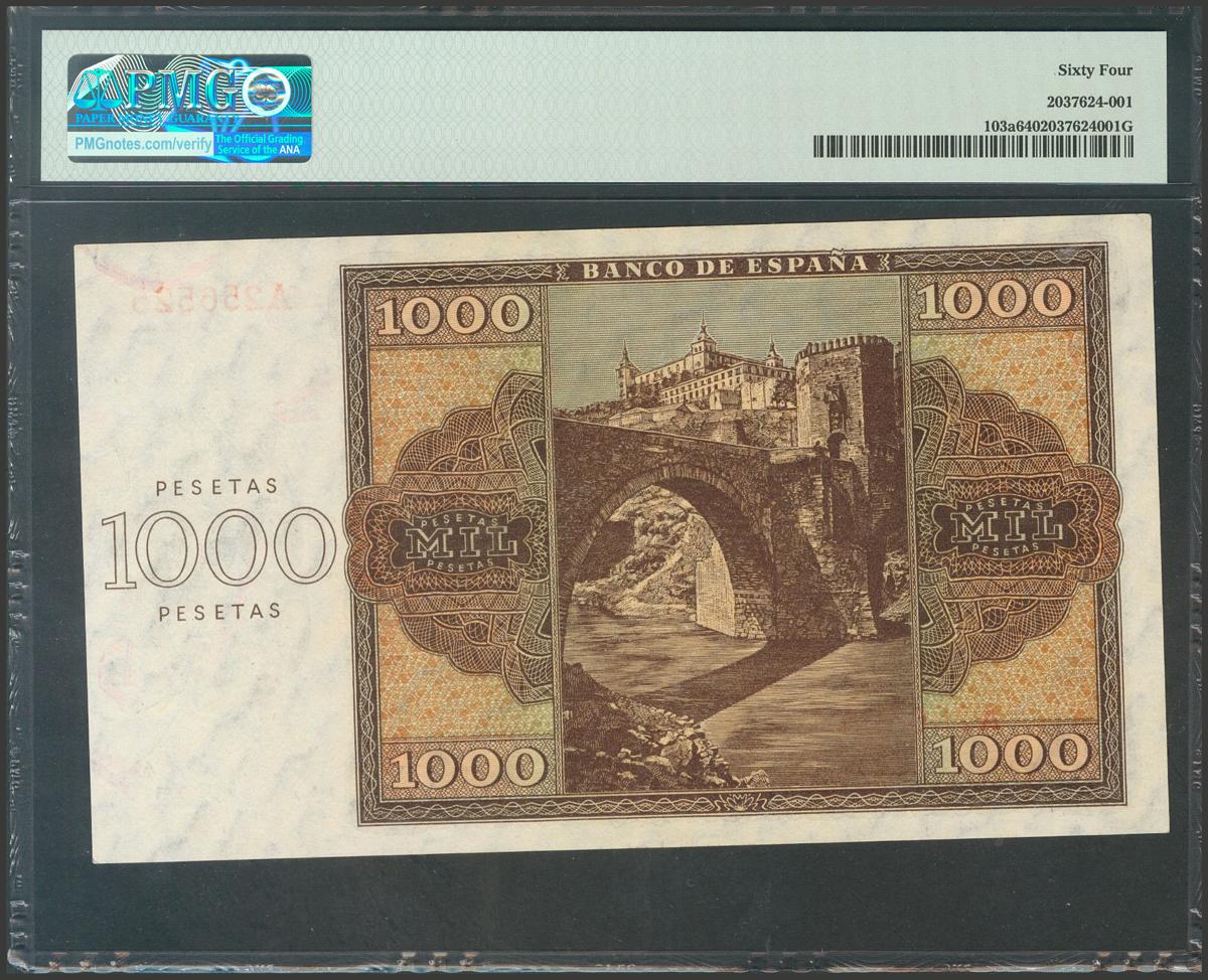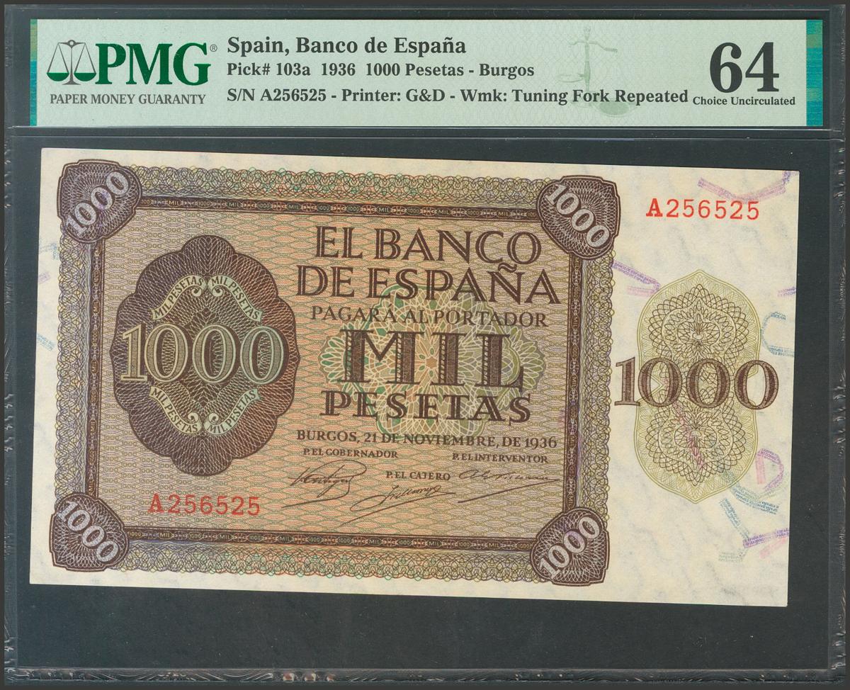 1000 Pesetas. November 21, 1936. Series A. (Edifil 2017: 423). Very rare in this quality, note of enormous importance and interest. Uncirculated. PMG64 package. (To get an idea of the rarity, as of July 1, 2021, this banknote is the fifth best graduate in PMG)