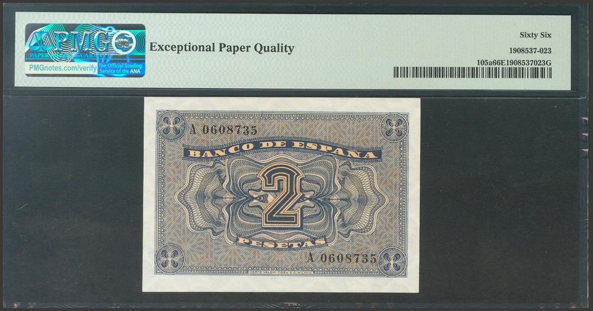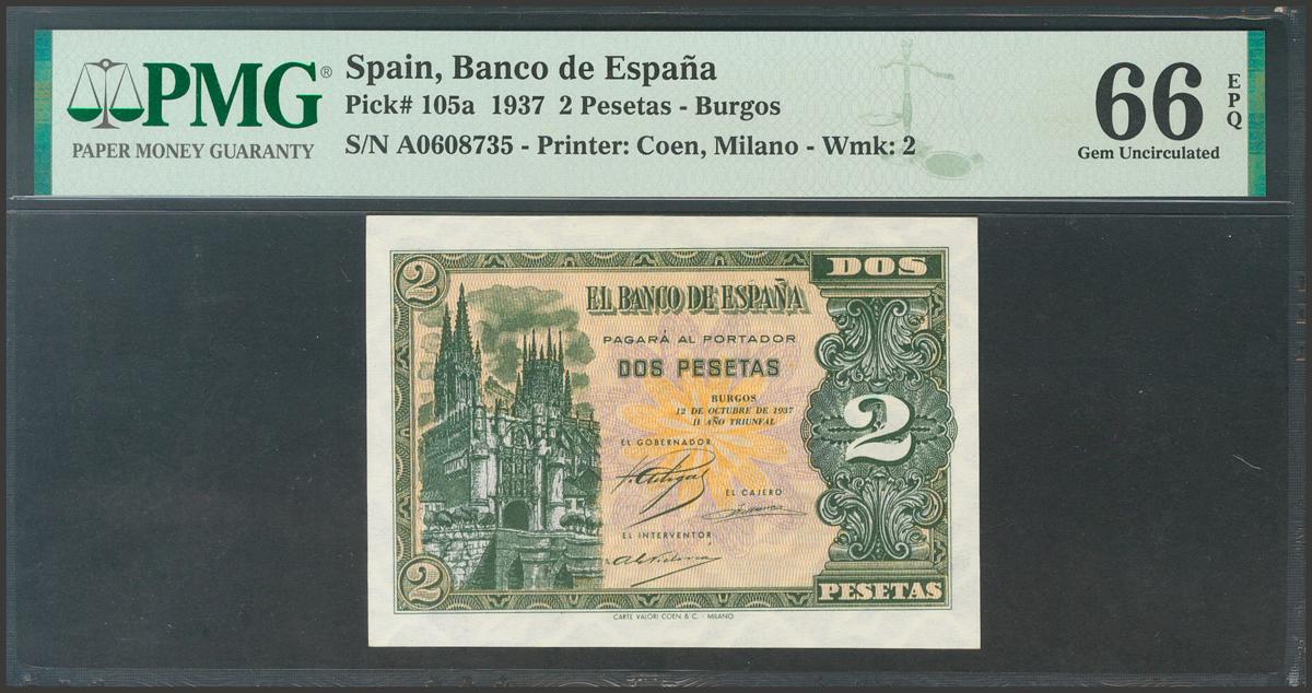 2 Pesetas. October 12, 1937. Series A. (Edifil 2017: 426a). Original sizing. Uncirculated. Package PMG66EPQ.