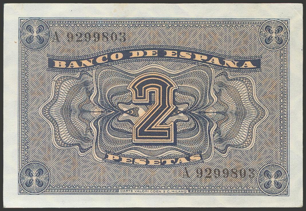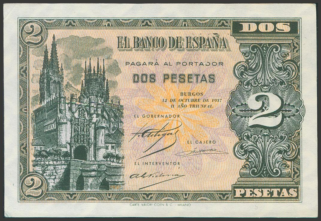 2 Pesetas. October 12, 1937. Series A. (Edifil 2021: 426). Original sizing, counting mark and folded corner. EBC ++.