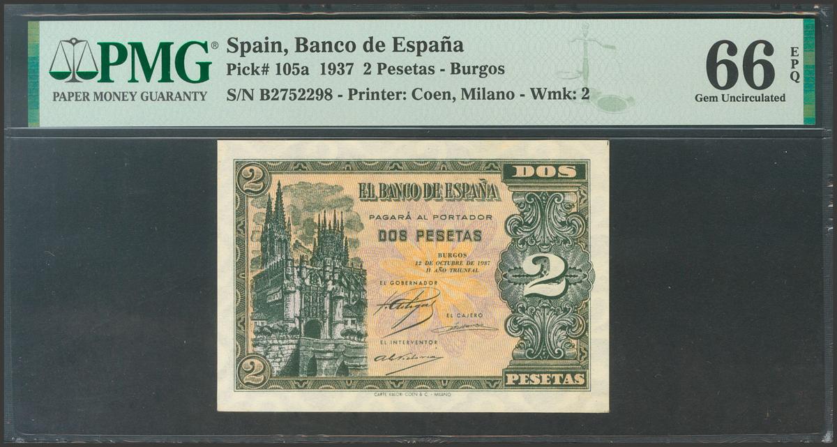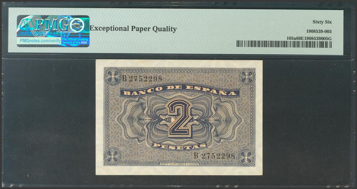 2 Pesetas. October 12, 1937. Series B. (Edifil 2017: 426a). Original sizing. Uncirculated. Package PMG66EPQ.