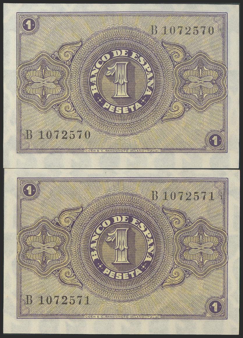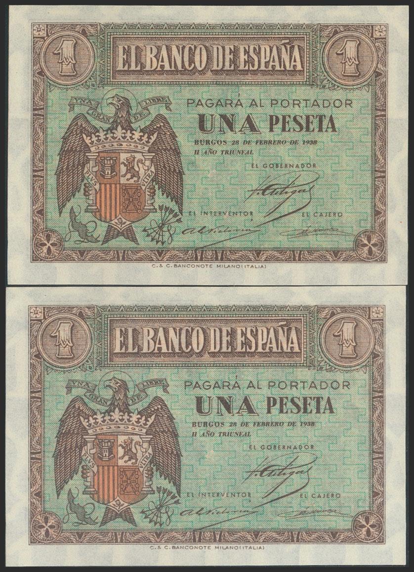 1 peseta. February 28, 1938. Correlative pair. Series B. (Edifil 2017: 427a). Preserves all the original sizing. Uncirculated.