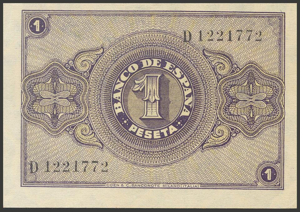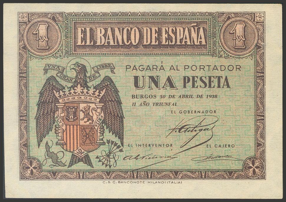 1 peseta. April 30, 1938. Series D. (Edifil 2017: 428a). Original sizing, lower left corner presents a very slight bend. EBC ++.