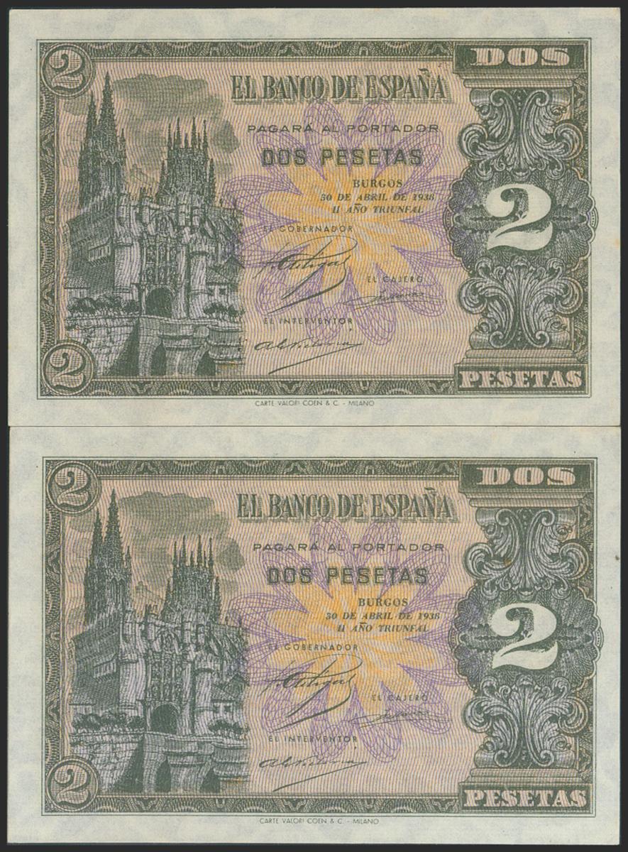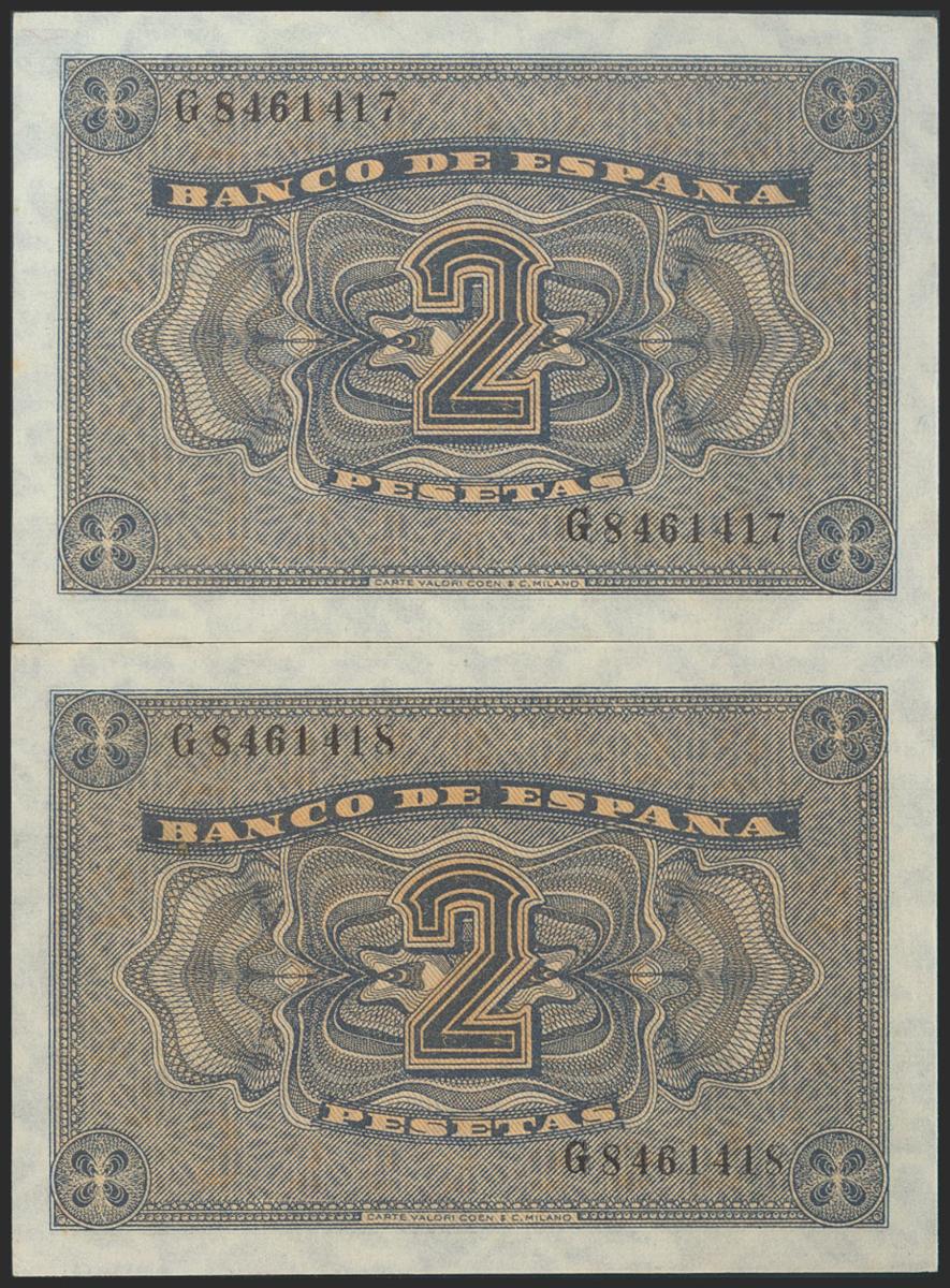 2 Pesetas. April 30, 1938. Correlative pair. Series G. (Edifil 2017: 429a). Original sizing. Uncirculated/ Almost Uncirculated.