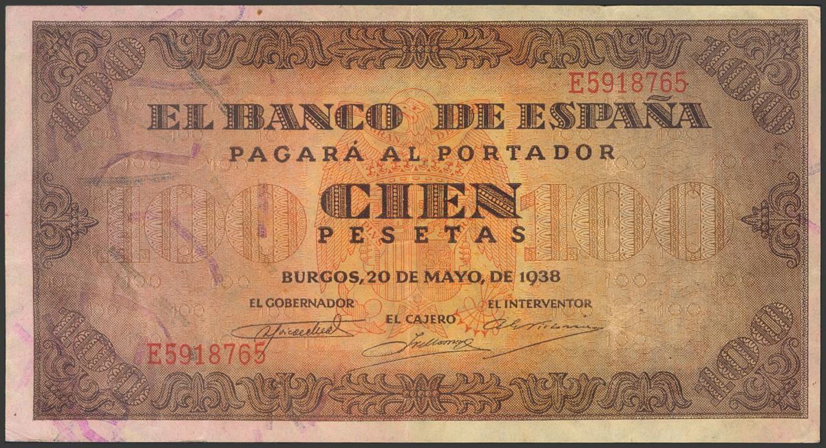 100 pesetas. May 20, 1938. Series E. (Edifil 2017: 432a). Retains part of the original size. Extremely Fine.