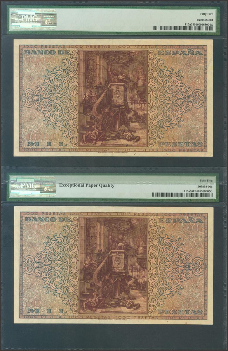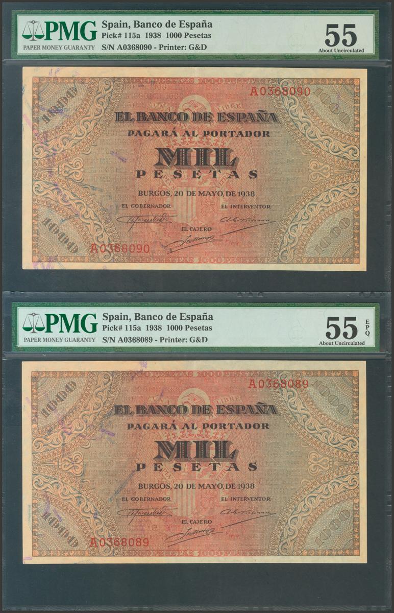 1000 Pesetas. May 20, 1938. Correlative couple. Series A. (Edifil 2021: 434). Very rare, especially in this exceptional quality. Good Extremely Fine. PMG55 / 55EPQ package, respectively.