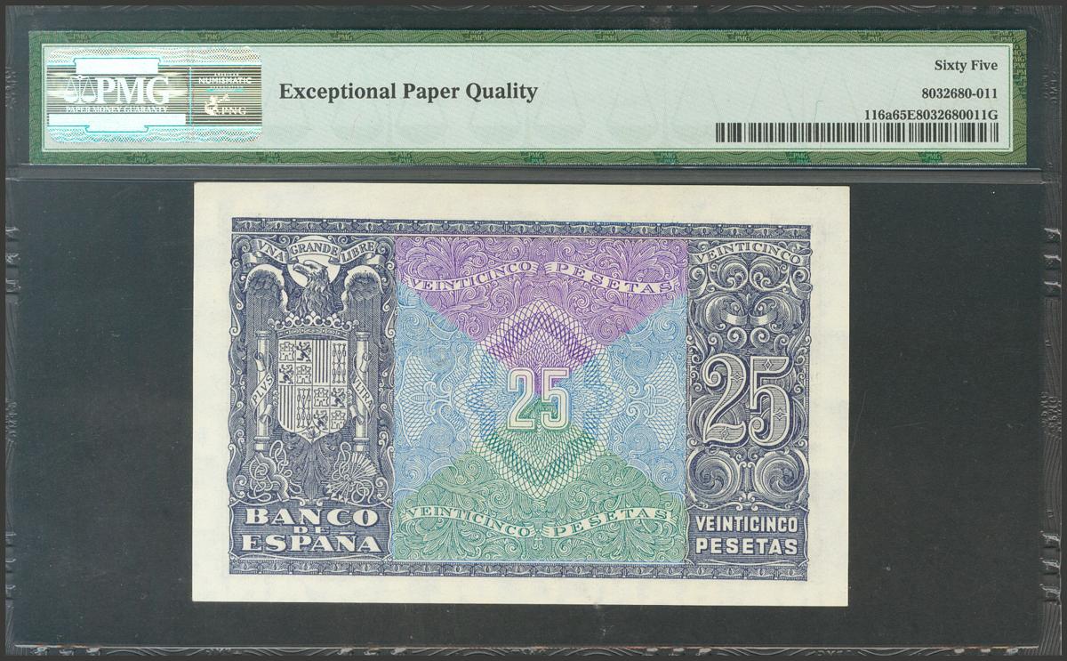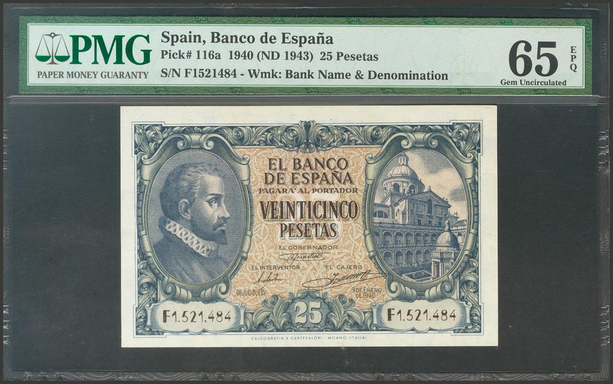 25 Pesetas. January 9, 1940. Series F. (Edifil 2021: 436a). Rare in this exceptional quality, original sizing. Uncirculated. Packaged PMG65EPQ.