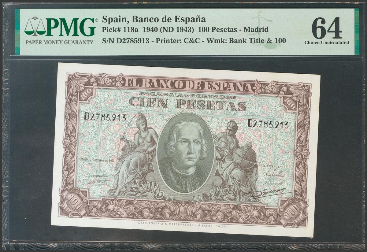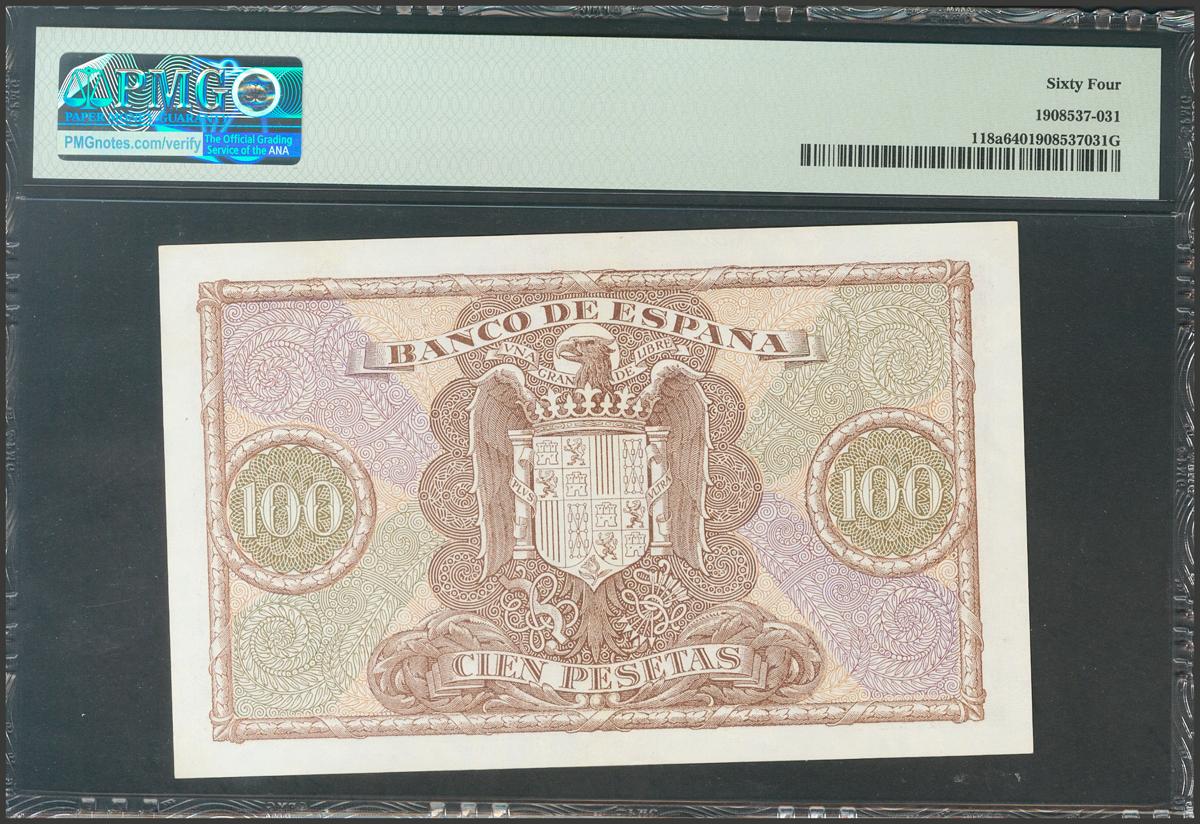 100 pesetas. January 9, 1940. Series D. (Edifil 2017: 438a). Uncirculated. PMG64 package.
