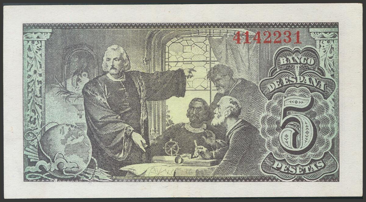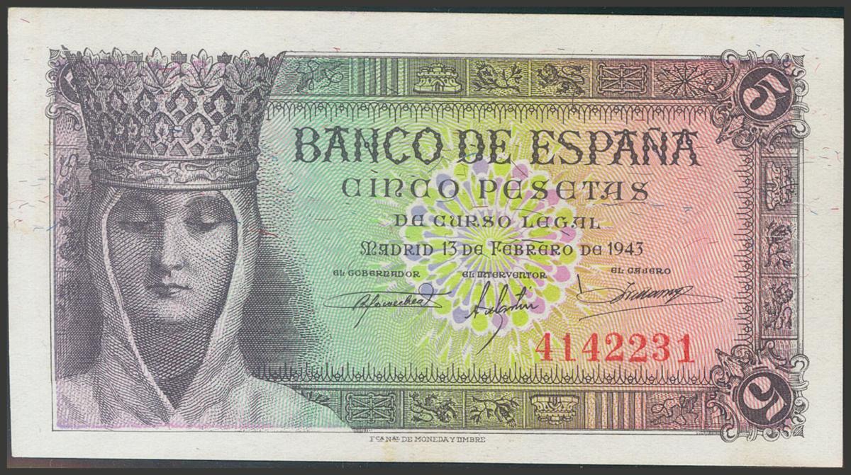 5 Pesetas. February 13, 1943. Without series. (Edifil 2017: 446). Original sizing. Good Extremely Fine.