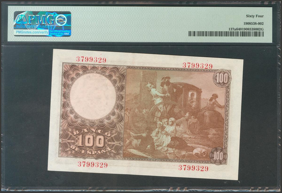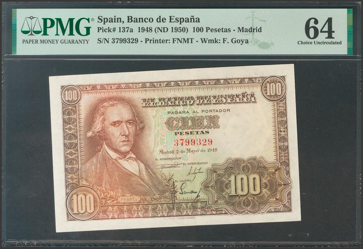 English 100 pesetas. May 2, 1948. Without series. (Edifil 2017: 456). Uncirculated. PMG64 package.
