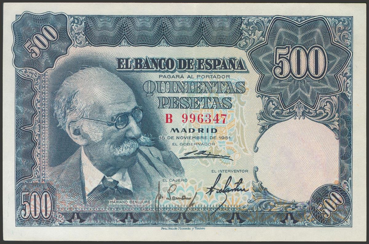 English 500 pesetas. November 15, 1951. Series B. (Edifil 2017: 460a). It retains a large part of its original size. Extremely Fine.