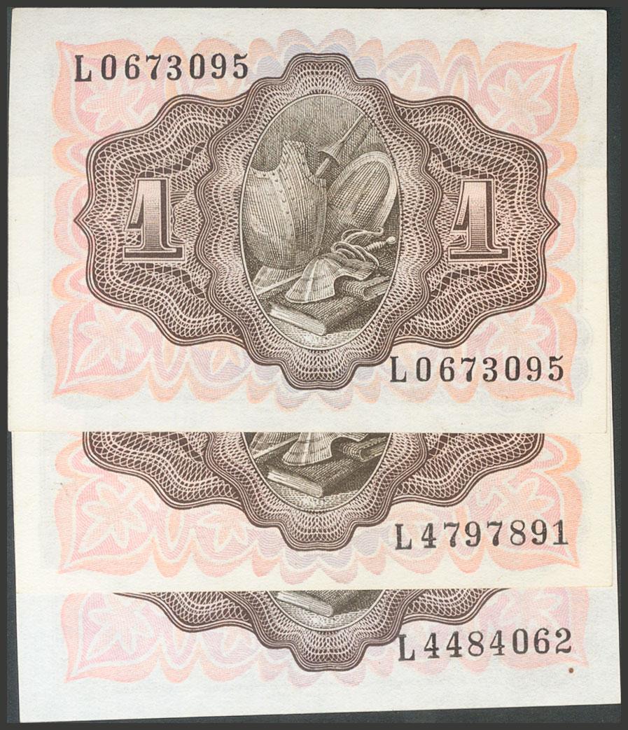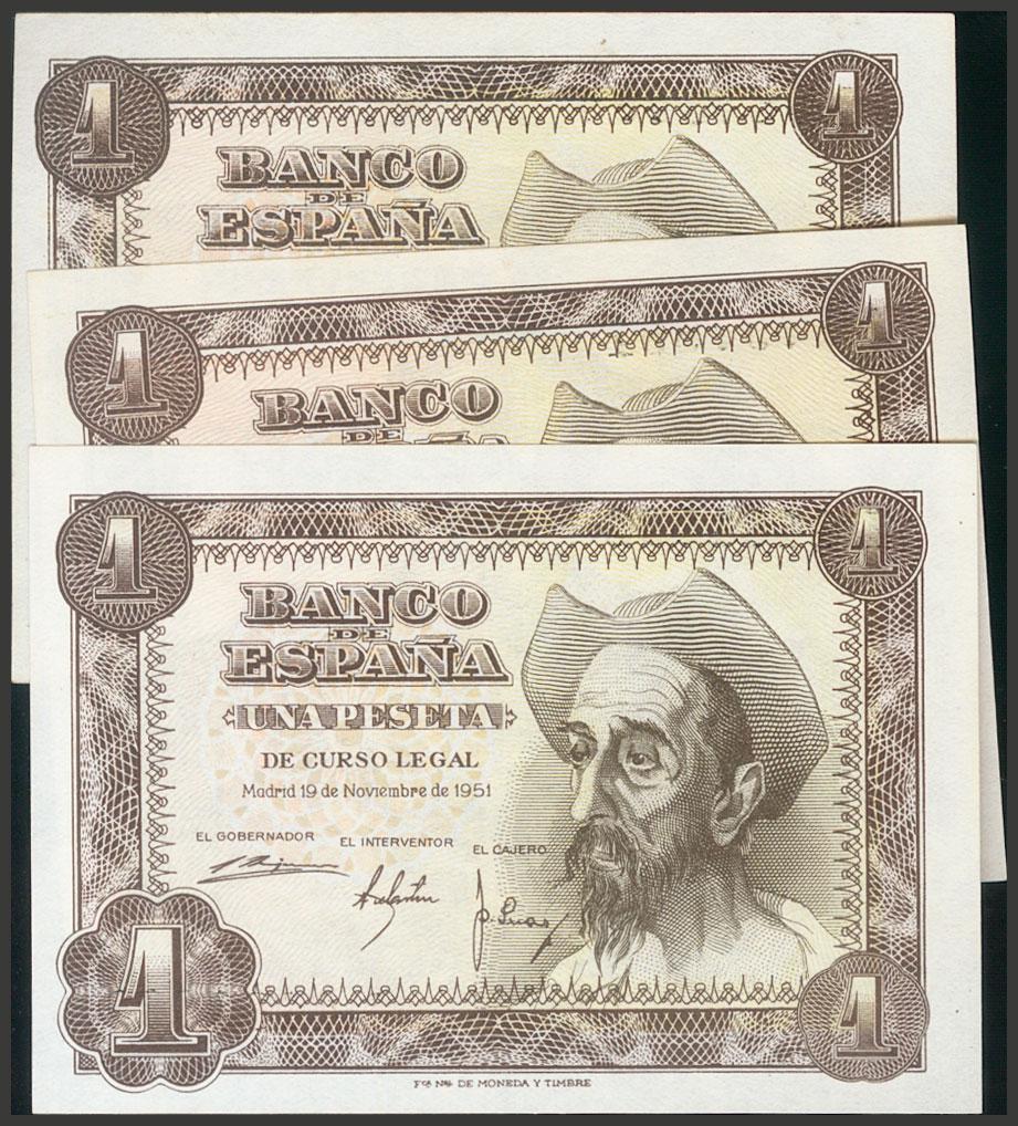 Set of 3 1 Peseta banknotes issued on November 19, 1951, with the L series (Edifil 2017: 461a), original size. Uncirculated.