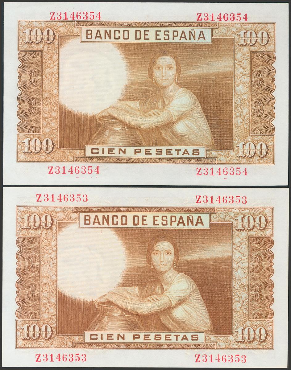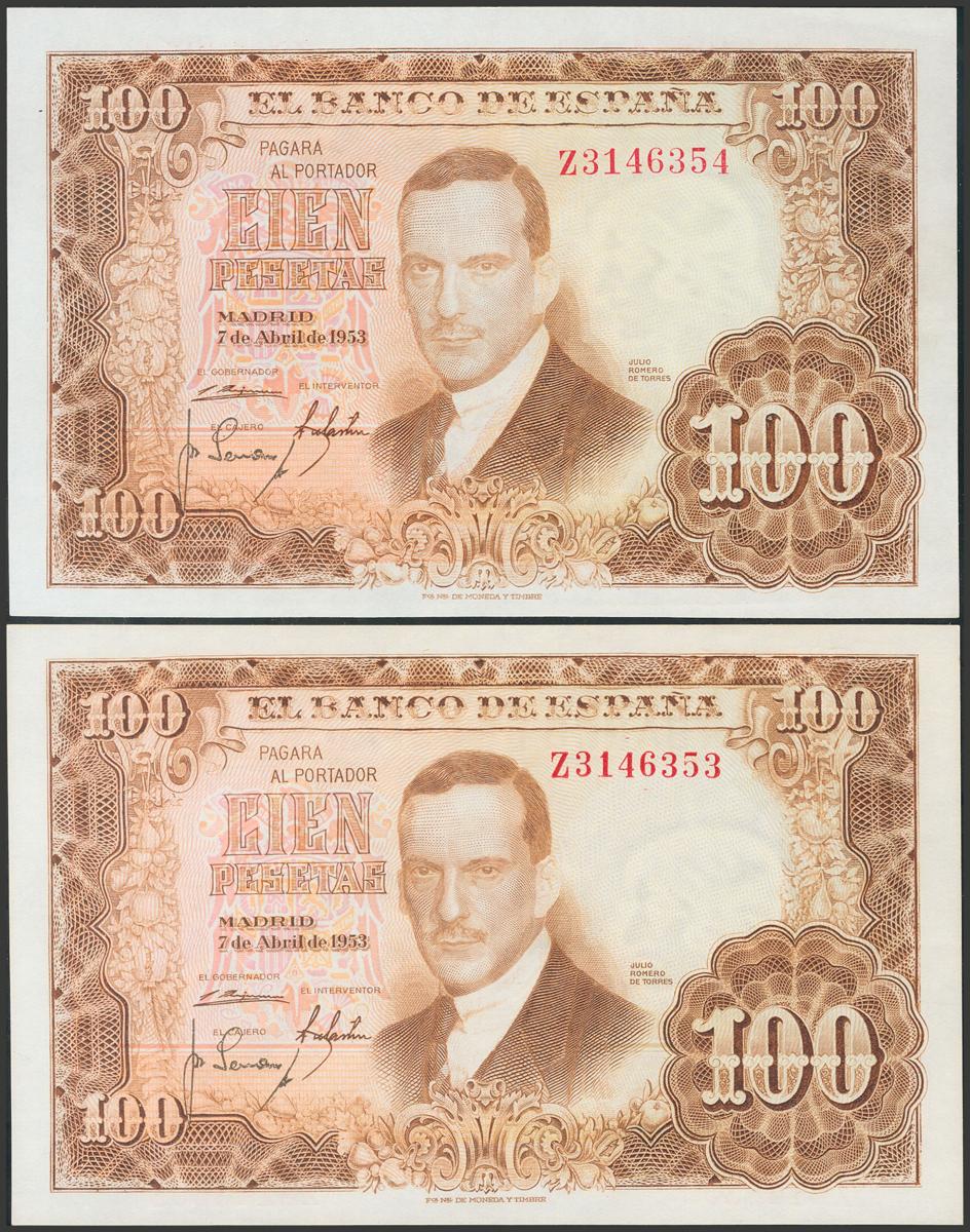 100 pesetas. April 7, 1953. Correlative couple. Series Z. (Edifil 2017: 464b). It keeps all its original size. Almost Uncirculated.