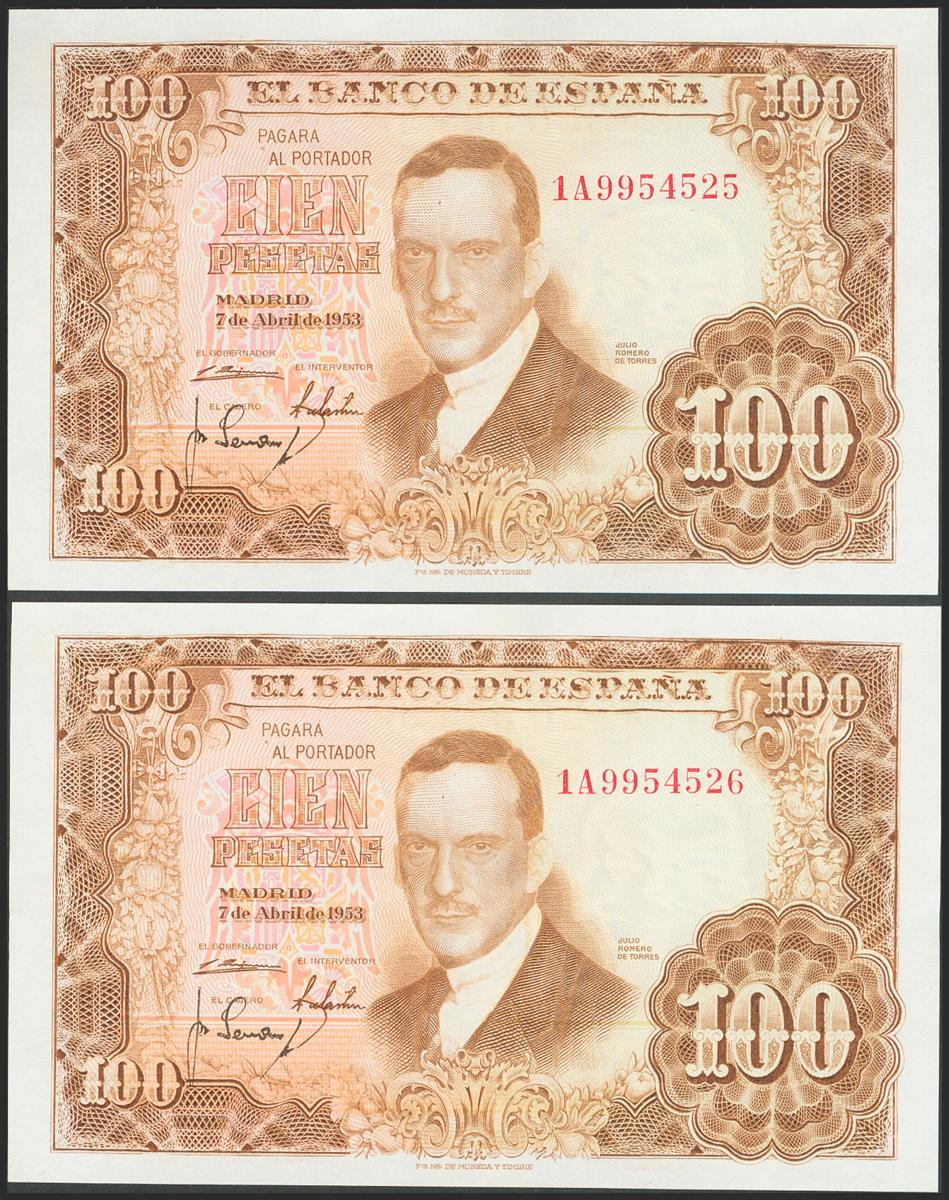 100 pesetas. April 7, 1953. Correlative couple. Series 1A. (Edifil 2017: 464c). Good Extremely Fine.