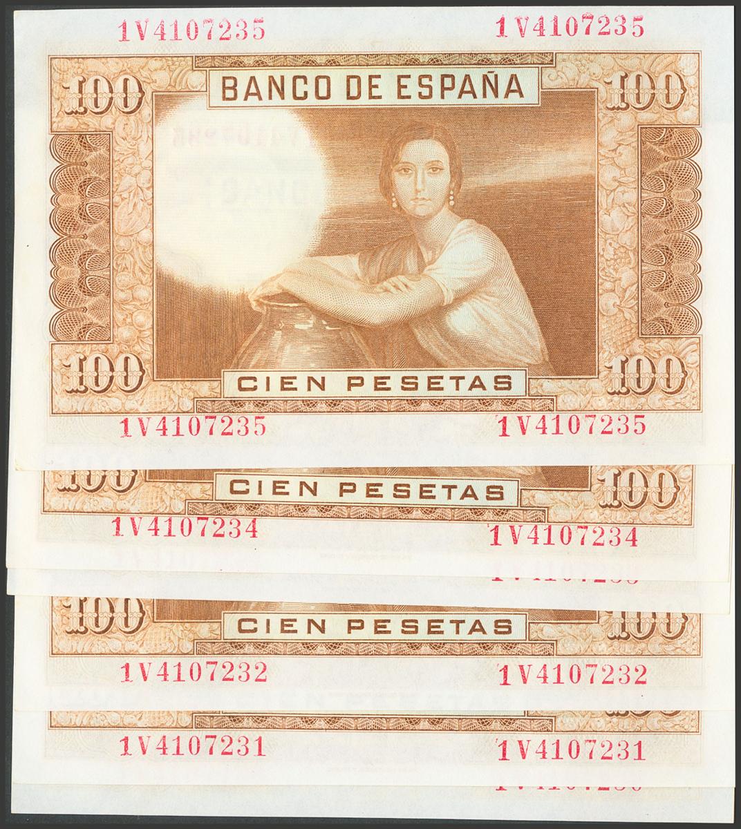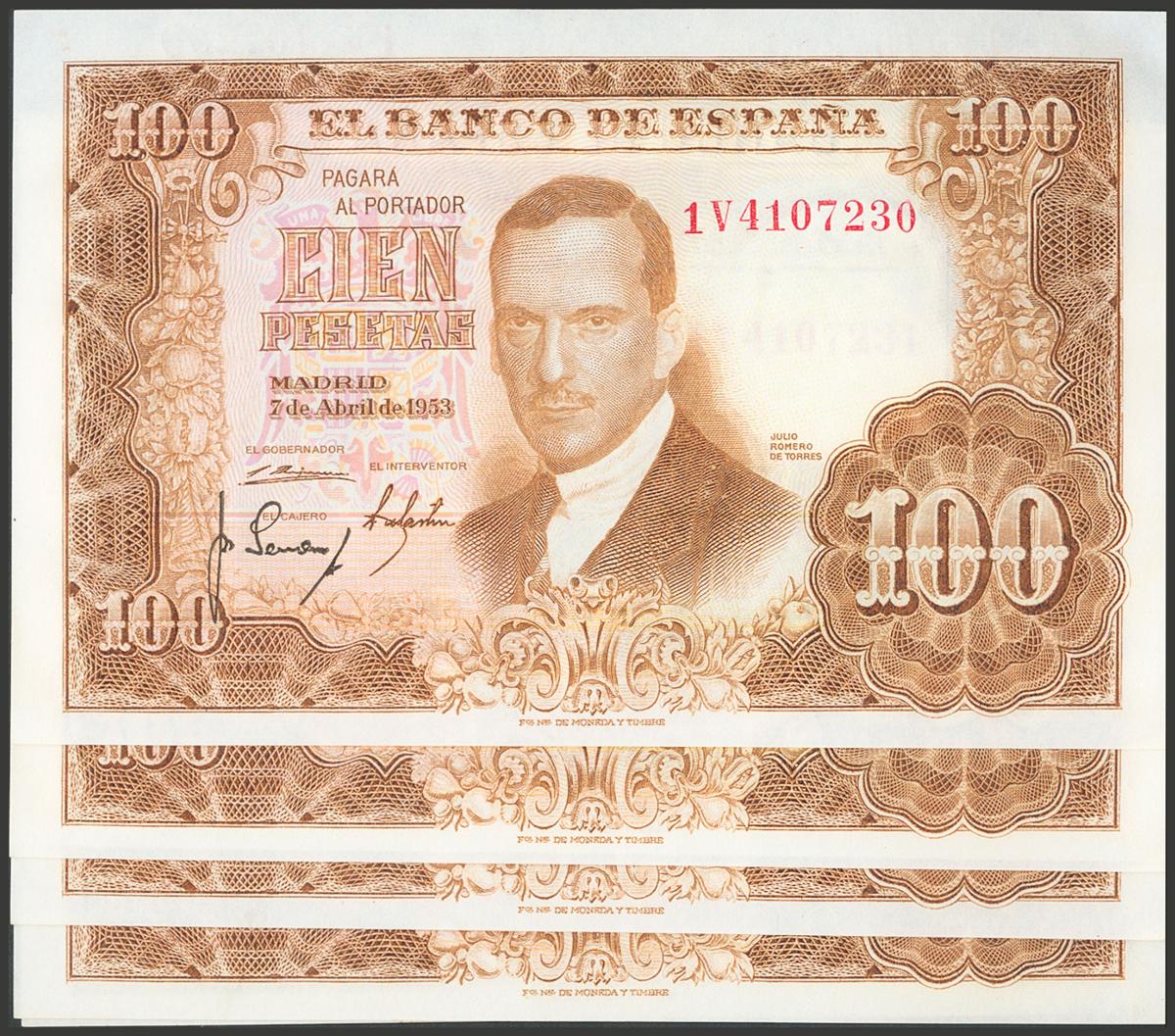 Set of 6 banknotes of 100 Pesetas issued on April 7, 1953 and with the series 1V. (Edifil 2017: 464c). Uncirculated/ Almost Uncirculated.