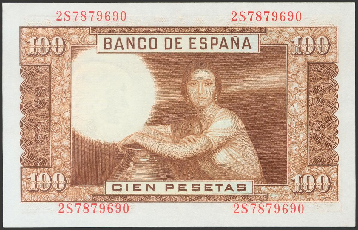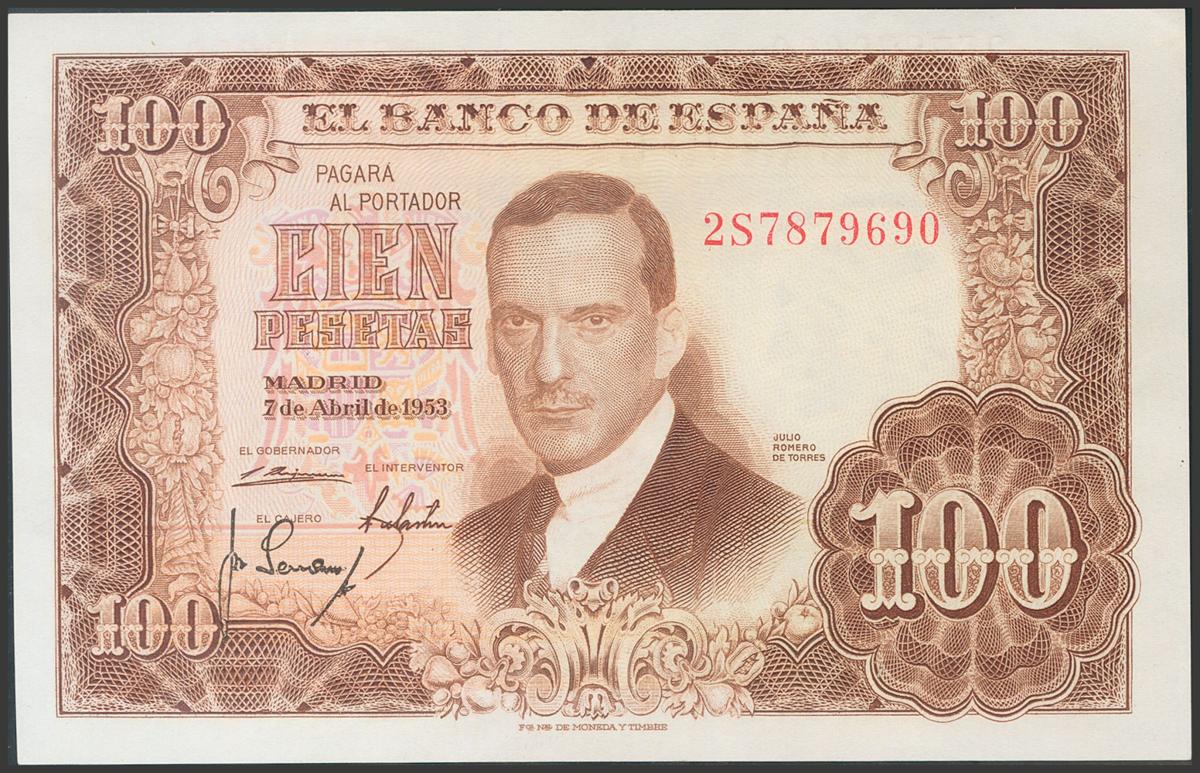 100 pesetas. April 7, 1953. Series 2S. (Edifil 2017: 464c). Preserves all the original sizing. Uncirculated.