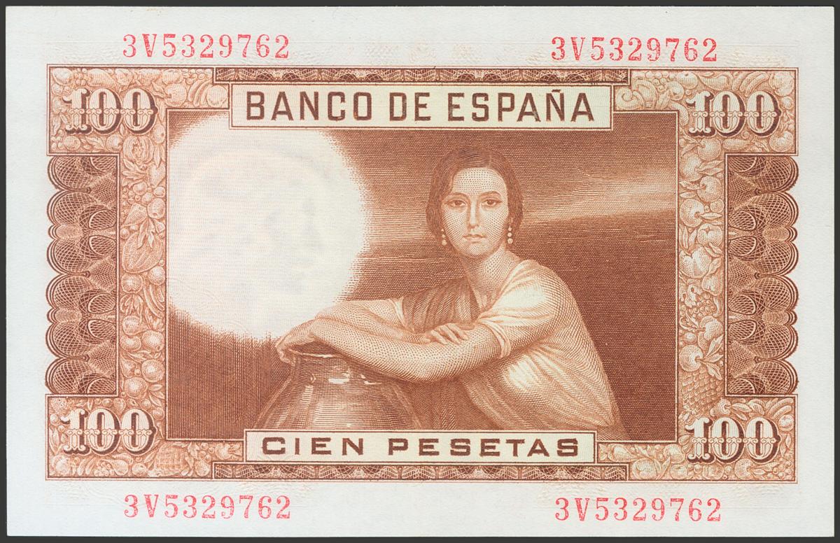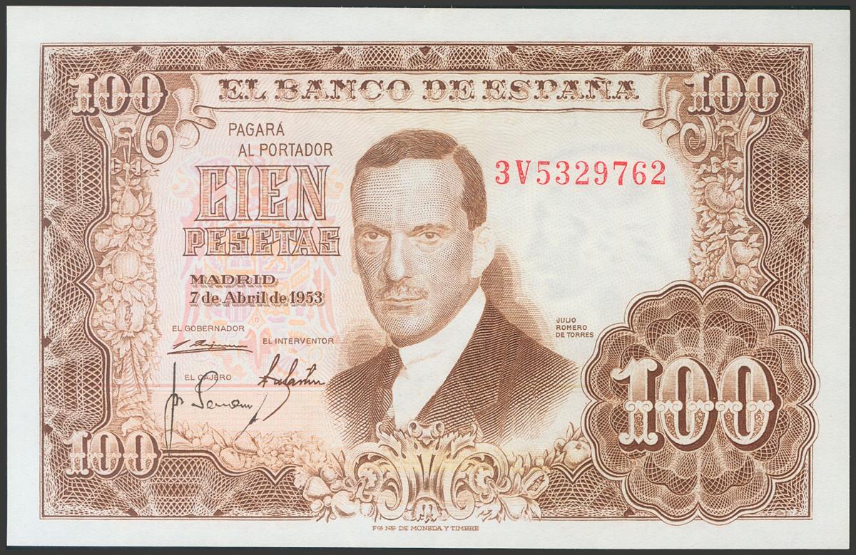 100 pesetas. April 7, 1953. Series 3V. (Edifil 2017: 464c). It keeps all its original size. Good Extremely Fine.