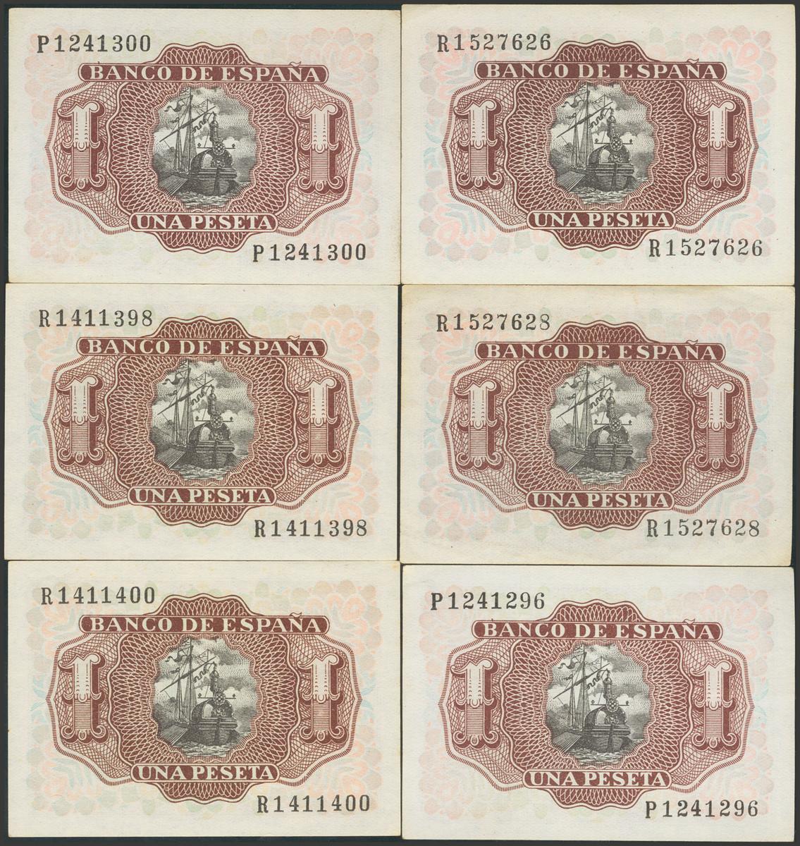 Set of 6 1 Peseta banknotes issued on July 22, 1953, almost correlative and with the series R. (Edifil 2017: 465a). Uncirculated/ Extremely Fine.