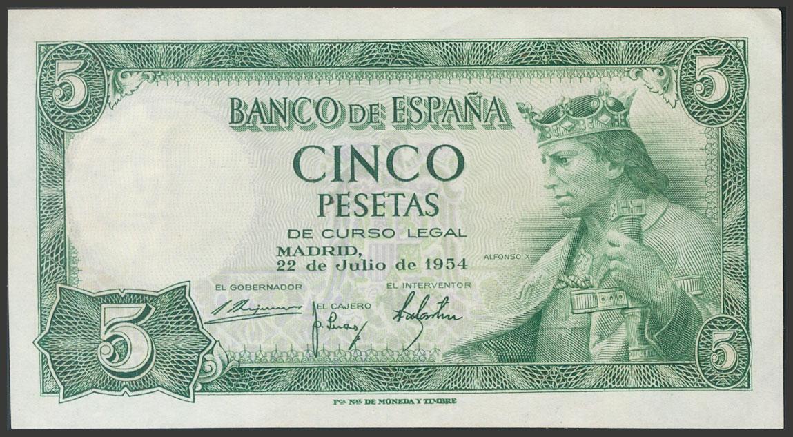 5 Pesetas. July 22, 1954. Series I. (Edifil 2017: 466a). It keeps all its original size. Good Extremely Fine.