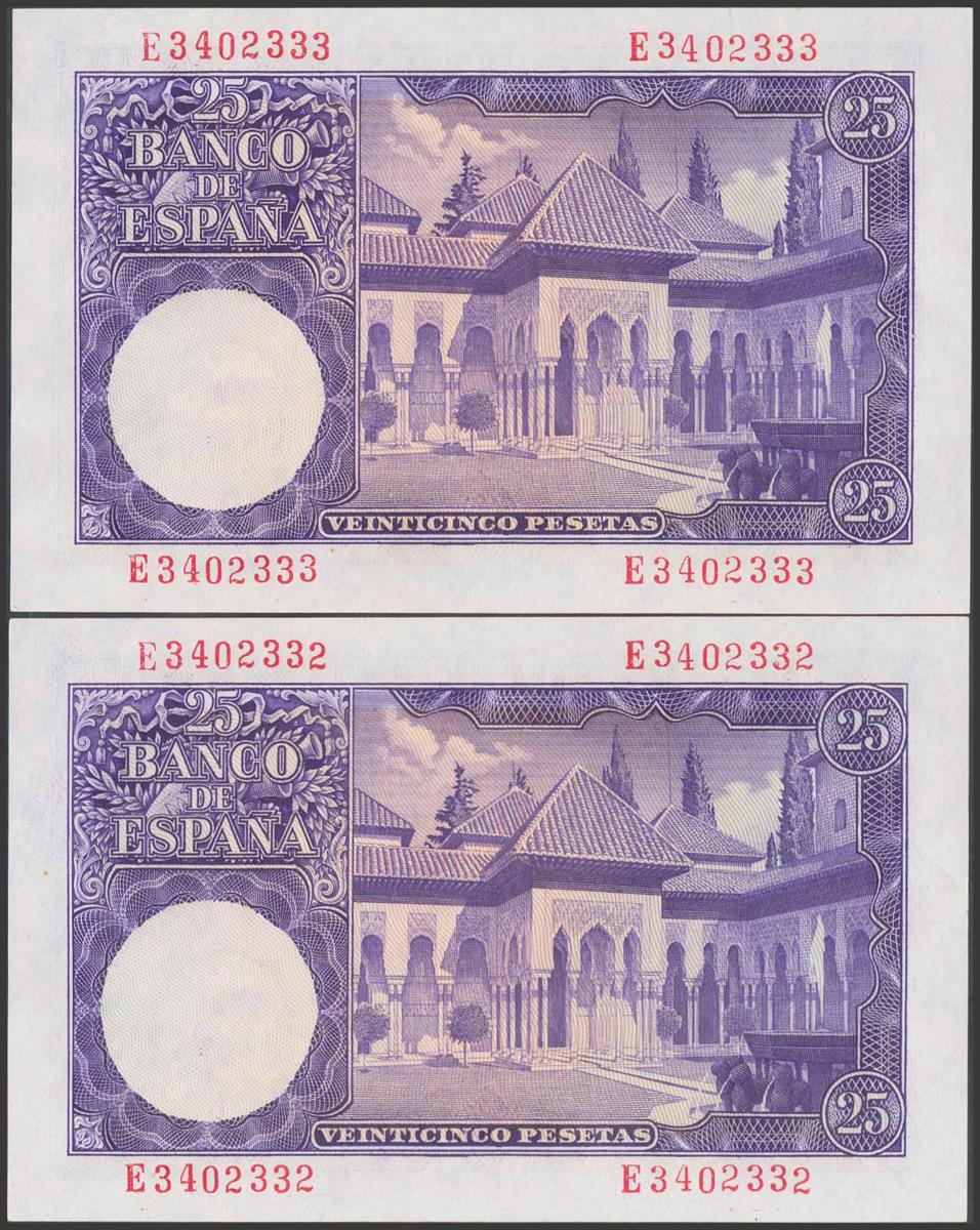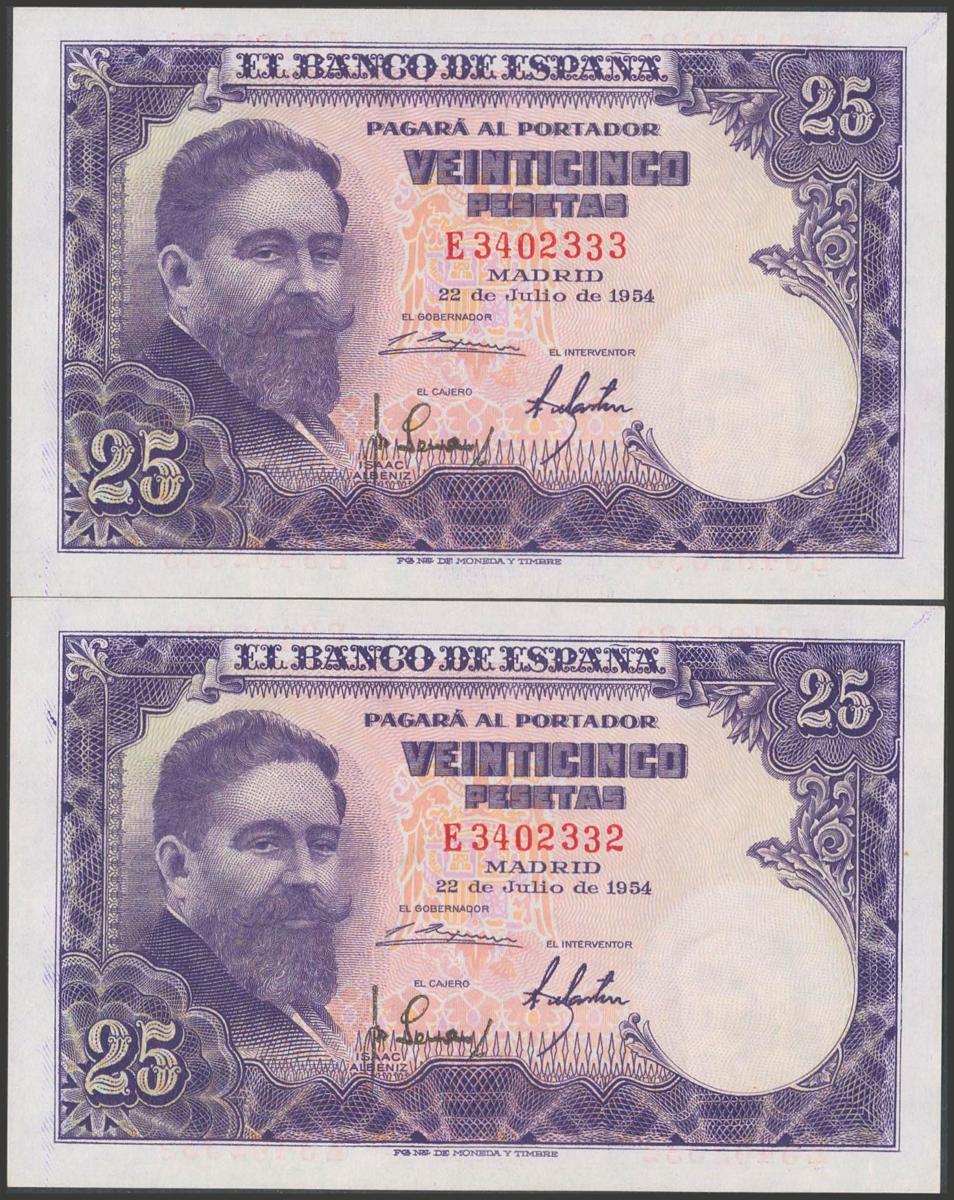 English 25 Pesetas. July 22, 1954. Correlative couple. Series E. (Edifil 2017: 467a). It keeps all its original size. Almost Uncirculated.